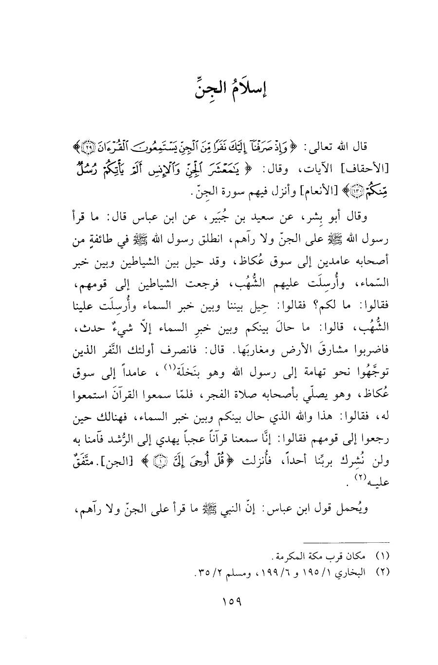 قال الله تعالى: {وَإِذْ صَرَفْنَا إِلَيْكَ نَفَرًا مِنَ الْجِنِّ يَسْتَمِعُونَ الْقُرْآنَ} [الأحقاف: 29] ، وقال: {يَا مَعْشَرَ الْجِنِّ وَالْأِنْسِ أَلَمْ يَأْتِكُمْ رُسُلٌ مِنْكُمْ} [الأنعام: 130] وأنزل فيهم سورة الجن.