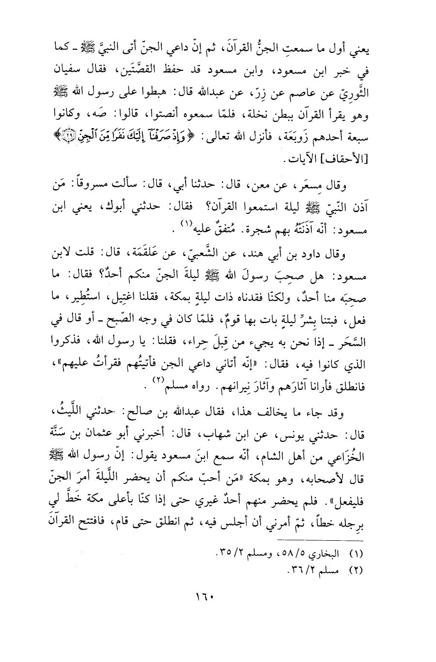 وقد جاء ما يخالف هذا، فقال عبد الله بن صالح: حدثني الليث، قال: حدثني يونس، عن ابن شهاب، قال: أخبرني أبو عثمان بن سنة الخزاعي من أهل الشام، أنه سمع ابن مسعود يقول: إن رسول الله صلى الله عليه وسلم قال لأصحابه، وهو بمكة: "من أحب منكم أن يحضر الليل أمر الجن فليفعل". فلم يحضر منهم أحد غيري حتى إذا كنا بأعلى مكة خط لي برجله خطا، ثم أمرني أن أجلس فيه، ثم انطلق حتى قام، فافتتح القرآن