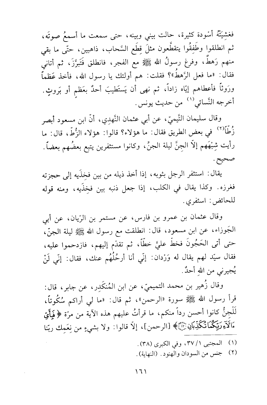 فغشيته أسودة كثيرة، حالت بيني وبينه، حتى سمعت ما أسمع صوته، ثم انطلقوا وطفقوا يتقطعون مثل قطع السحاب، ذاهبين، حتى ما بقي منهم رهط، وفرغ رسول الله صلى الله عليه وسلم مع الفجر، فانطلق فتبرز، ثم أتاني فقال: "ما فعل الرهط؟ " فقلت: هم أولئك يا رسول الله، فأخذ عظما وروثا فأعطاهم إياه زادا، ثم نهى أن يستطيب أحد بعظم أو بروث. أخرجه النسائي من حديث يونس.