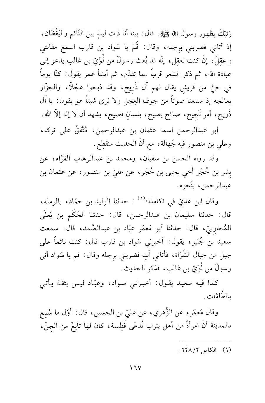 وقال ابن عدي في "كامله": حدثنا الوليد بن حماد، بالرملة، قال: حدثنا سليمان بن عبد الرحمن، قال: حدثنا الحكم بن يعلى المحاربي، قال: حدثنا أبو معمر عباد بن عبد الصمد، قال: سمعت سعيد بن جبير، يقول: أخبرني سواد بن قارب قال: كنت نائما على جبل من جبال الشراة، فأتاني آت فضربني برجله وقال: قم يا سواد أتى رسول من لؤي بن غالب، فذكر الحديث.