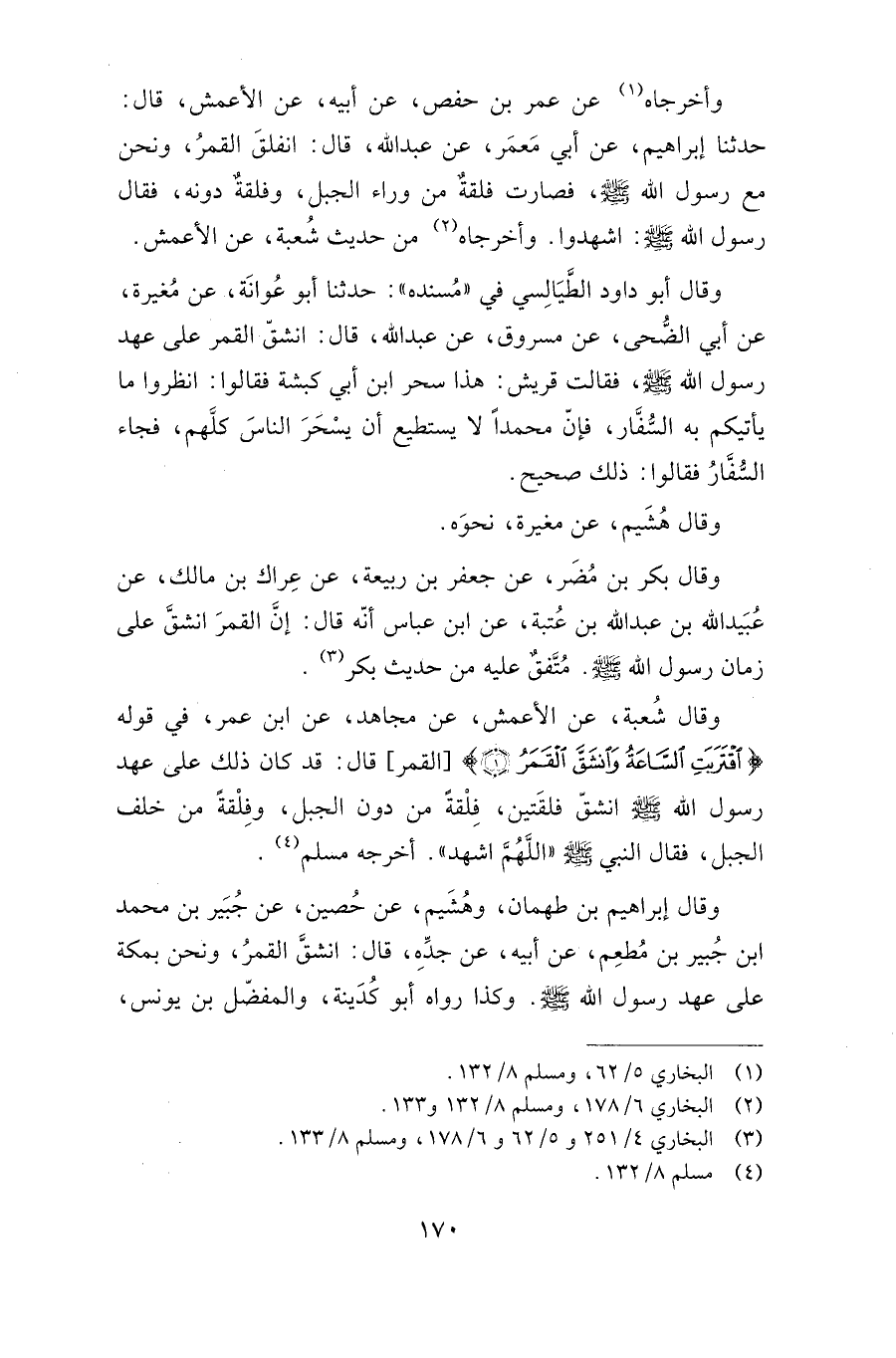 وقال شعبة، عن الأعمش، عن مجاهد، عن ابن عمر، في قوله: {اقْتَرَبَتِ السَّاعَةُ وَانْشَقَّ الْقَمَرُ} [القمر: 1] ، قال: قد كان ذلك على عهد رسول الله صلى الله عليه وسلم انشق فلقتين، فلقة من دون الجبل، وفلقة من خلف الجبل، فقال النبي صلى الله عليه وسلم: "اللهم اشهد". أخرجه مسلم.