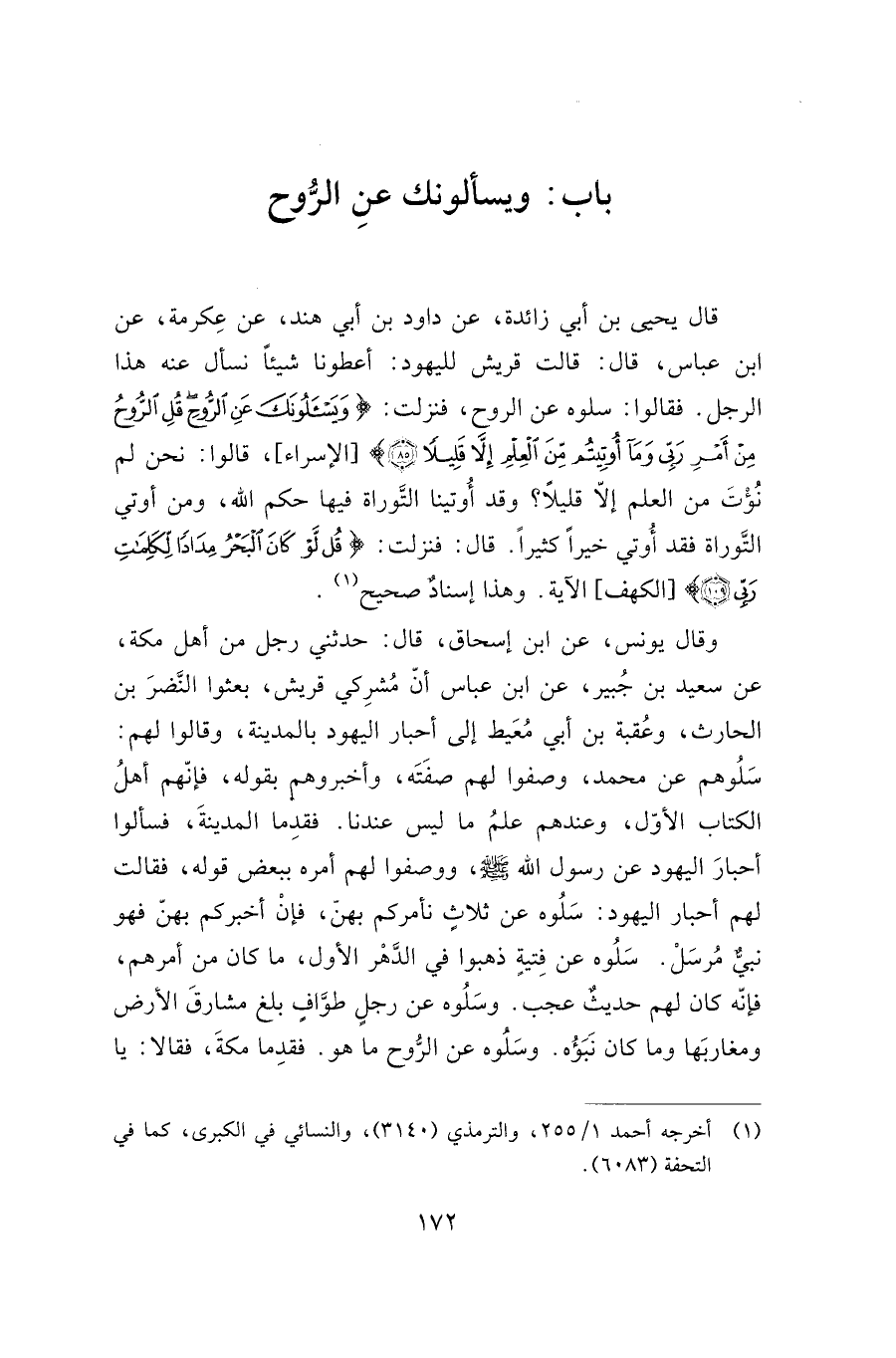 قال يحيى بن أبي زائدة, عن داود بن أبي هند، عن عكرمة، عن ابن عباس، قال: قالت قريش لليهود: أعطونا شيئا نسأل عنه هذا الرجل. فقالوا: سلوه عن الروح، فنزلت: {وَيَسْأَلونَكَ عَنِ الرُّوحِ قُلِ الرُّوحُ مِنْ أَمْرِ رَبِّي وَمَا أُوتِيتُمْ مِنَ الْعِلْمِ} [الإسراء: 85] ، قالوا: نحن لم نؤت من العلم إلا قليلا؟ وقد أوتينا التوراة فيها حكم الله، ومن أوتي التوراة فقد أوتي خيرا كثيرا. قال: فنزلت: {قُلْ لَوْ كَانَ الْبَحْرُ مِدَادًا لِكَلِمَاتِ رَبِّي} [الكهف: 109] ، وهذا إسناد صحيح.