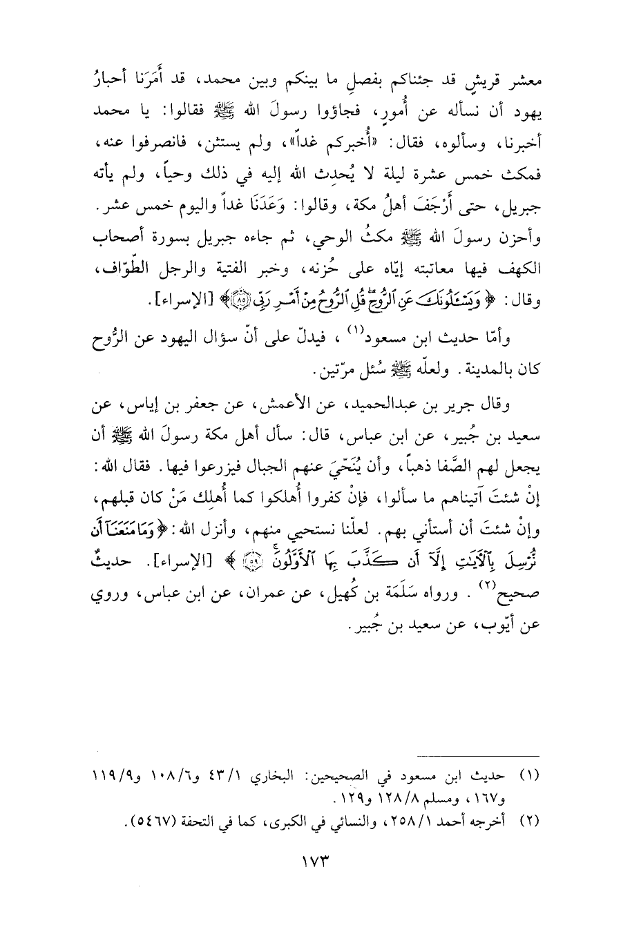 معشر قريش قد جئناكم بفصل ما بينكم وبين محمد، قد أمرنا أحبار يهود أن نسأله عن أمور، فجاءوا رسول الله صلى الله عليه وسلم فقالوا: يا محمد أخبرنا، وسألوه، فقال: "أخبركم غدا"، ولم يستثن، فانصرفوا عنه، فمكث خمس عشرة ليلة لا يحدث الله إليه في ذلك وحيا، ولم يأته جبريل، حتى أرجف أهل مكة، وقالوا: وعدنا غدا واليوم خمس عشر. وأحزن رسول الله صلى الله عليه وسلم مكث الوحي، ثم جاءه جبريل بسورة أصحاب الكهف فيها معاتبته إياه على حزنه، وخبر الفتية والرجل الطواف، وقال: {وَيَسْأَلونَكَ عَنِ الرُّوحِ قُلِ الرُّوحُ مِنْ أَمْرِ رَبِّي} [الإسراء: 85] .