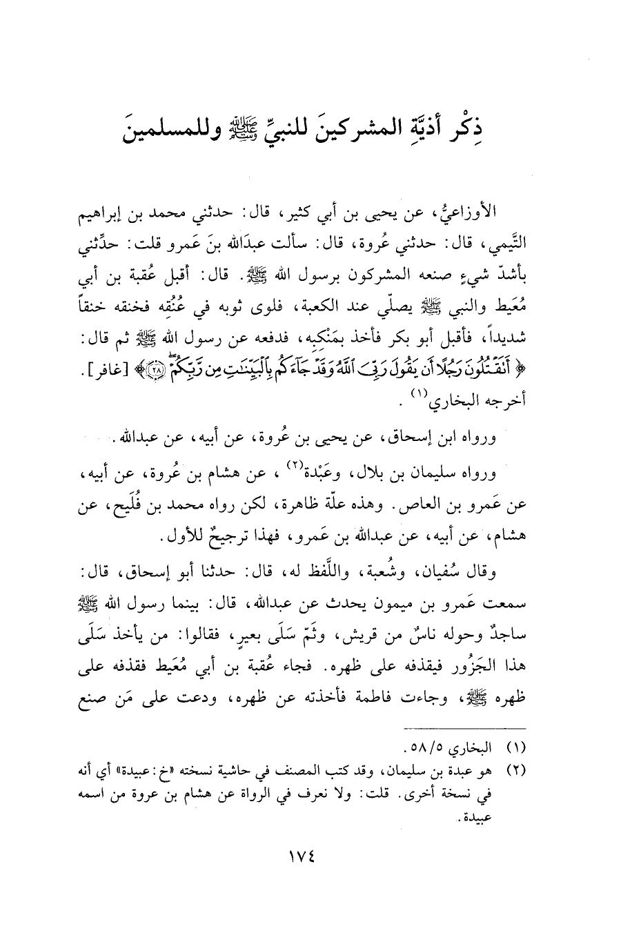 الأوزاعي، عن يحيى بن أبي كثير، قال: حدثني محمد بن إبراهيم التيمي، قال: حدثني عروة، قال: سألت عبد الله بن عمرو قلت: حدثني بأشد شيء صنعه المشركون برسول الله صلى الله عليه وسلم. قال: أقبل عقبة بن أبي معيط والنبي صلى الله عليه وسلم يصلي عند الكعبة، فلوى ثوبه في عنقه فخنقه خنقا شديدا، فأقبل أبو بكر فأخذ بمنكبه، فدفعه عن رسول الله صلى الله عليه وسلم ثم قال: {أَتَقْتُلُونَ رَجُلًا أَنْ يَقُولَ رَبِّيَ اللَّهُ وَقَدْ جَاءَكُمْ بِالْبَيِّنَاتِ مِنْ رَبِّكُمْ} [غافر: 28] أخرجه البخاري.