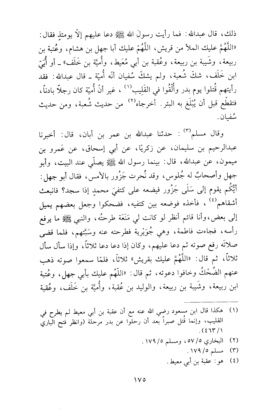 وقال مسلم: حدثنا عبد الله بن عمر بن أبان، قال: أخبرنا عبد الرحيم بن سليمان، عن زكريا، عن أبي إسحاق، عن عمرو بن ميمون، عن عبد الله، قال: بينما رسول الله صلى الله عليه وسلم يصلي عند البيت، وأبو جهل وأصحاب له جلوس، وقد نحرت جزور بالأمس، فقال: أبو جهل: أيكم يقوم إلى سلى جزور فيضعه على كتفي محمد إذا سجد؟ فانبعث أشقاهم، فأخذه فوضعه بين كتفيه، فضحكوا وجعل بعضهم يميل إلى بعض، وأنا قائم أنظر لو كانت لي منعة طرحته، والنبي صلى الله عليه وسلم ما يرفع رأسه، فجاءت فاطمة، وهي جويرية فطرحته عنه وسبتهم، فلما قضى صلاته رفع صوته ثم دعا عليهم، وكان إذا دعا دعا ثلاثا، وإذا سأل سأل ثلاثا، ثم قال: "اللهم عليك بقريش" ثلاثا، فلما سمعوا صوته ذهب عنهم الضحك وخافوا دعوته، ثم قال: "اللهم عليك بأبي جهل، وعتبة بن ربيعة، وشيبة بن ربيعة، والوليد بن عقبة، وأمية بن خلف، وعقبة