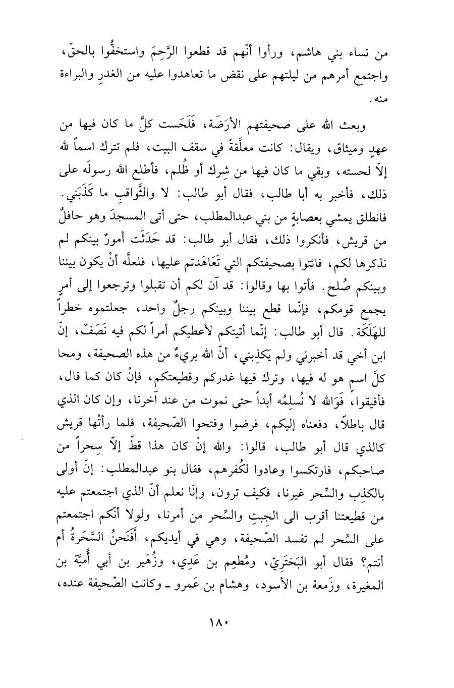 أبو طالب، قالوا: والله إن كان هذا قط إلا سحرا من صاحبكم، فارتكسوا وعادوا لكفرهم، فقال بنو عبد المطلب: إن أولى بالكذب والسحر غيرنا، فكيف ترون، وإنا نعلم أن الذي اجتمعتم عليه قطيعتنا أقرب إلى الجبت والسحر من أمرنا، ولولا أنكم اجتمعتم على السحر لم تفسد الصحيفة، وهي في أيديكم، أفنحن السحرة أم أنتم؟ فقال أبو البختري، ومطعم بن عدي، وزهير بن أبي أمية بن المغيرة، وزمعة بن الأسود، وهشام بن عمرو -وكانت الصحيفة عنده،
