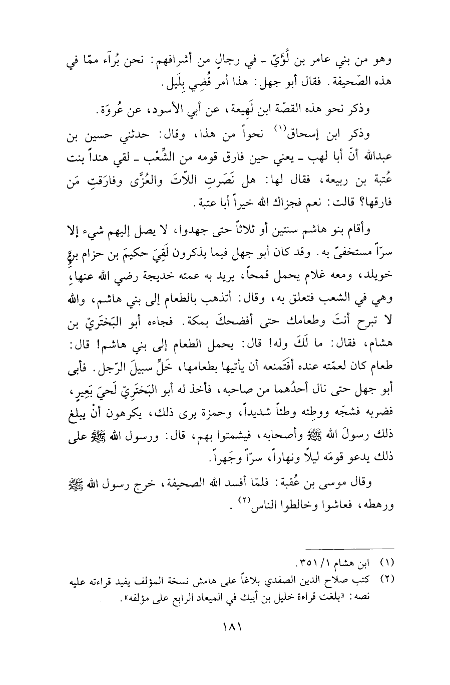وهو من بني عامر بن لؤي- في رجال من أشرافهم: نحن برآء مما في هذه الصحيفة. فقال أبو جهل: هذا أمر قضي بليل.