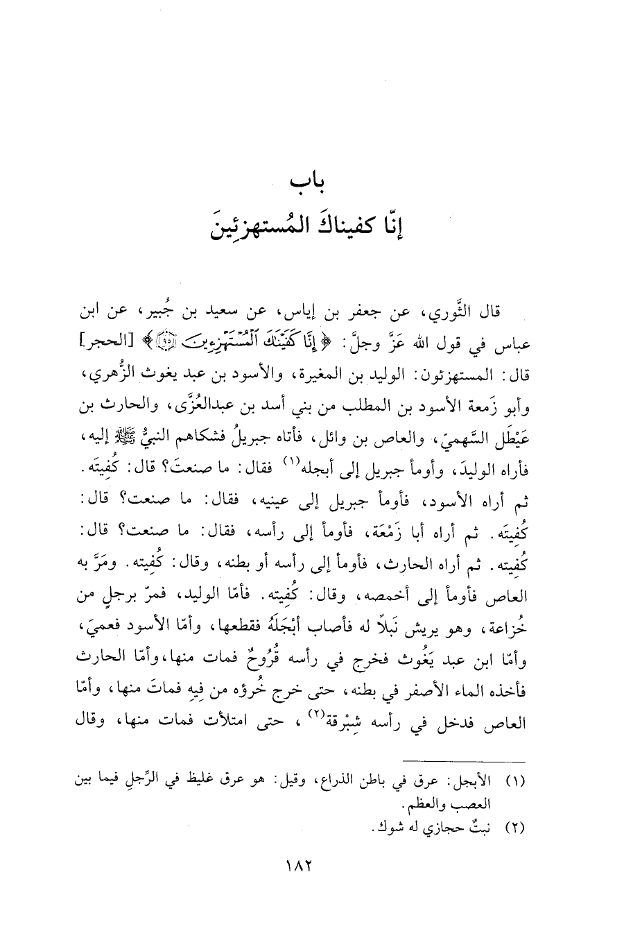 قال الثوري، عن جعفر بن إياس، عن سعيد بن جبير، عن ابن عباس في قول الله -عز وجل: {إِنَّا كَفَيْنَاكَ الْمُسْتَهْزِئينَ} [الحجر: 95] ، قال: المستهزئون: الوليد بن المغيرة، والأسود بن عبد يغوث الزهري، وأبو زمعة الأسود بن المطلب من بني أسد بن عبد العزى، والحارث بن عيطل السهمي، والعاص بن وائل، فأتاه جبريل فشكاهم النبي صلى الله عليه وسلم إليه، فأراه الوليد، وأومأ جبريل إلى أبجله فقال: "ما صنعت"؟ قال: كفيته. ثم أراه الأسود، فأومأ جبريل إلى عينيه، فقال: "ما صنعت"؟ قال: كفيته. ثم أراه أبا زمعة، فأومأ إلى رأسه، فقال: "ما صنعت"؟ قال: كفيته، ثم أراه الحارث، فأومأ إلى رأسه أو بطنه، وقال: كفيته. ومر به العاص فأومأ إلى أخمصه، وقال: كفيته. فأما الوليد، فمر برجل من خزاعة، وهو يريش نبلا له فأصاب أبجله فقطعها، وأما الأسود فعمي، وأما ابن عبد يغوث فخرج في رأسه قروح فمات منها، وأما الحارث فأخذه الماء الأصفر في بطنه، حتى خرج خرؤه من فيه فمات منها، وأما العاص فدخل في رأسله شبرقة، حتى امتلأت فمات منها، وقال