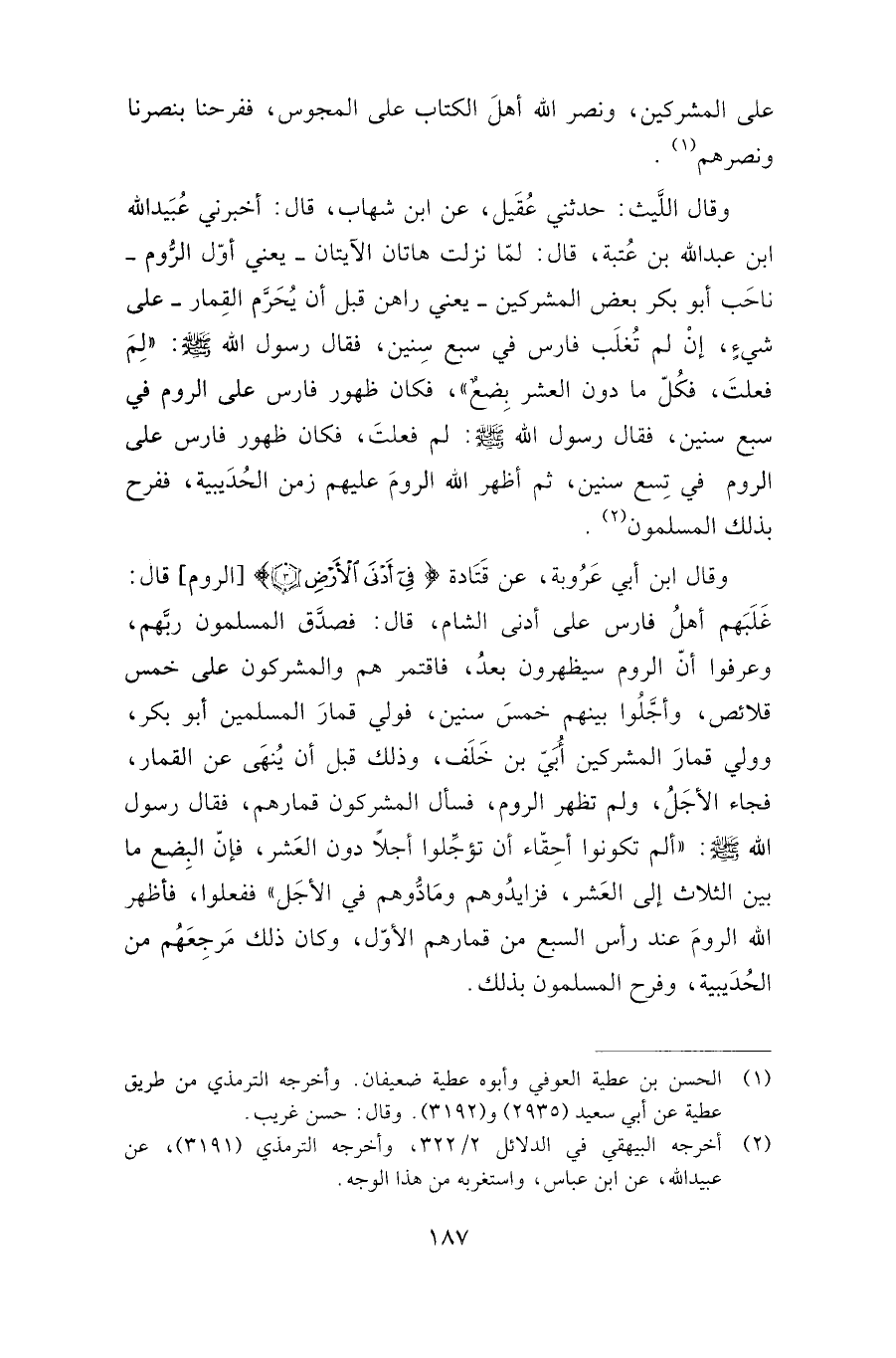 وقال الليث: حدثني عقيل، عن ابن شهاب، قال: أخبرني عبيد الله بن عبد الله بن عتبة، قال: لما نزلت هاتان الآيتان -يعني أول الروم- ناحب أبو بكر بعض المشركين -يعني راهن قبل أن يحرم القمار- على شيء، إن لم تغلب فارس في سبع سنين، فقال رسول الله صلى الله عليه وسلم: "لم فعلت؟ فكل ما دون العشر بضع". فكان ظهور فارس على الروم في سبع