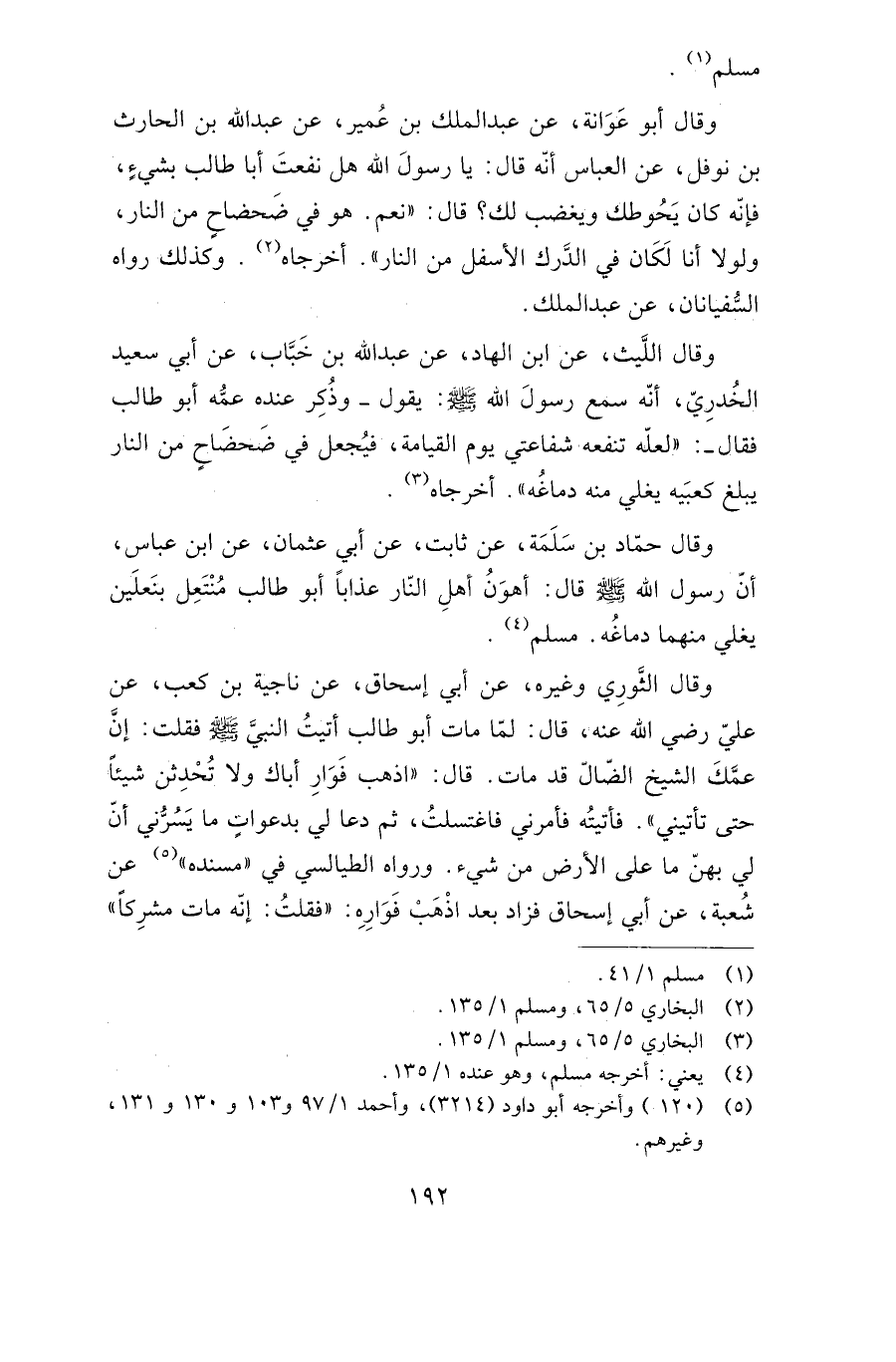 وقال حماد بن سلمة، عن ثابت، عن أبي عثمان، عن ابن عباس، أن رسول الله صلى الله عليه وسلم قال: "أهون أهل النار عذابا أبو طالب منتعل بنعلين يغلي منهما دماغه". مسلم.