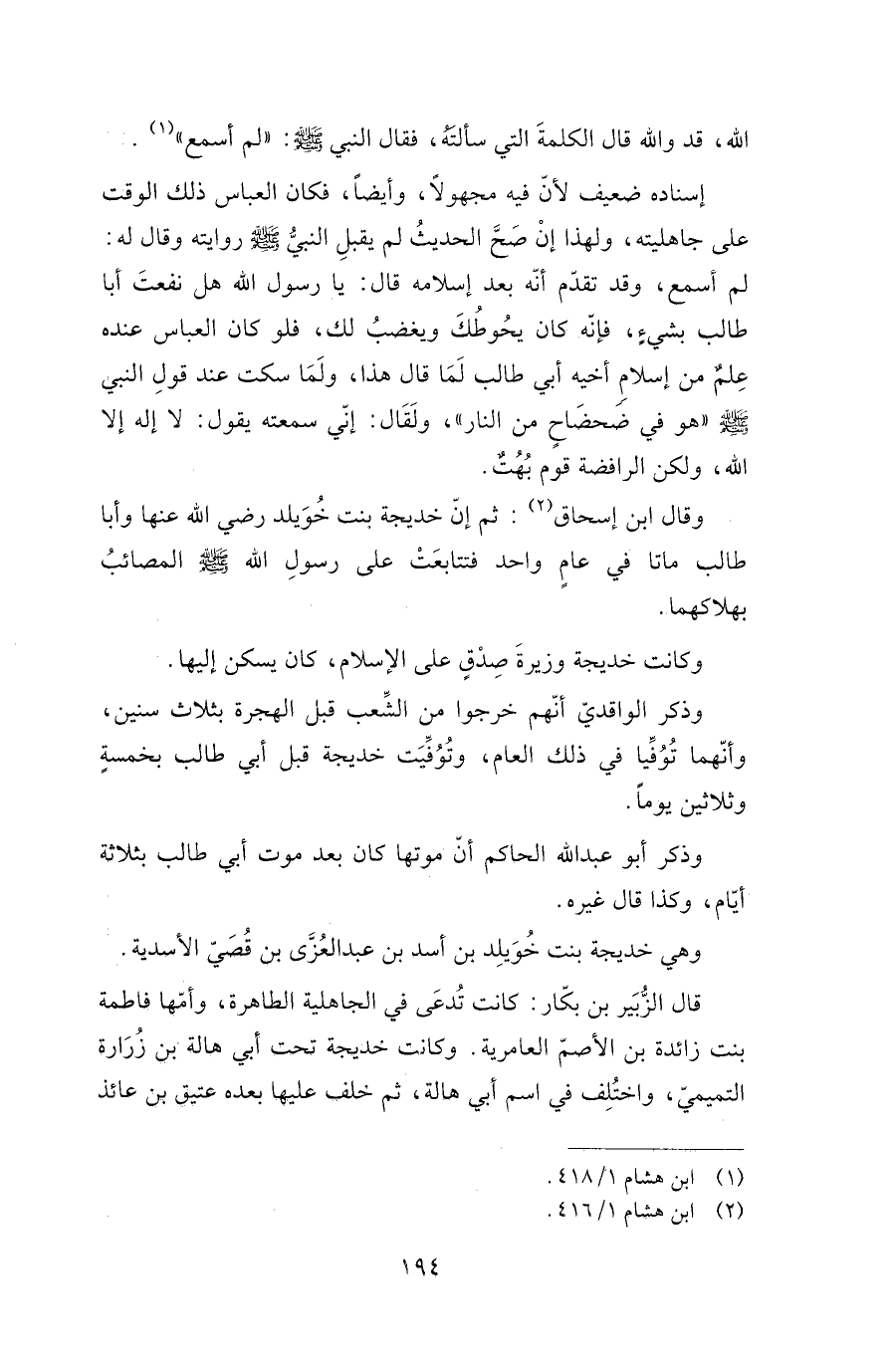 وقال ابن إسحاق: ثم إن خديجة بنت خويلد رضي الله عنها وأبا طالب ماتا في عام واحد فتتابعت على رسول الله صلى الله عليه وسلم المصائب بهلاكهما.
