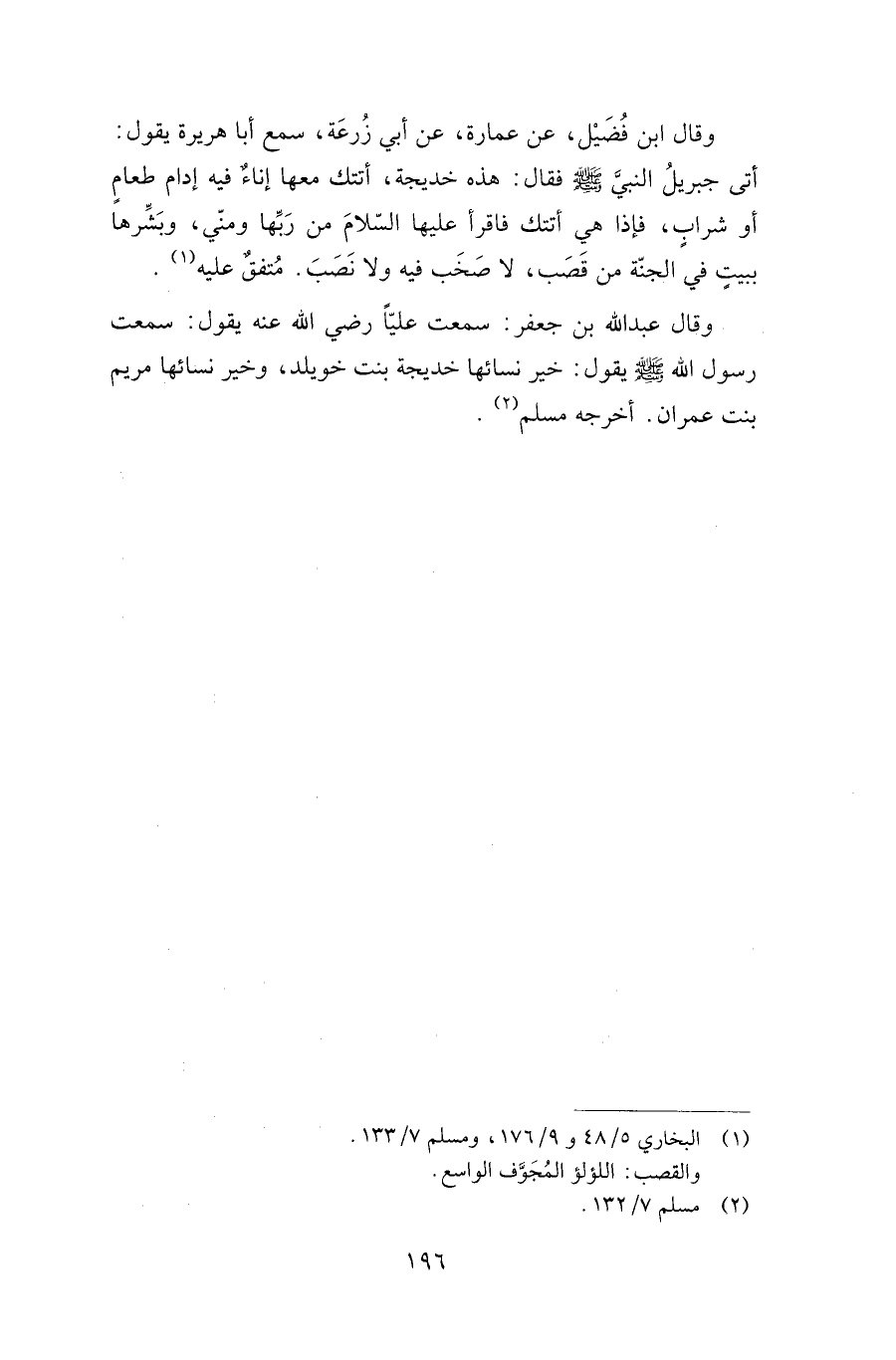 وقال ابن فضيل، عن عمارة، عن أبي زرعة، سمع أبا هريرة يقول: أتى جبريل النبي صلى الله عليه وسلم فقال: هذه خديجة، أتتك معها إناء فيه إدام طعام أو شراب، فإذا هي أتتك فاقرأ عليها السلام من ربها ومني، وبشرها ببيت في الجنة من قصب، لا صخب فيه ولا نصب. متفق عليه.