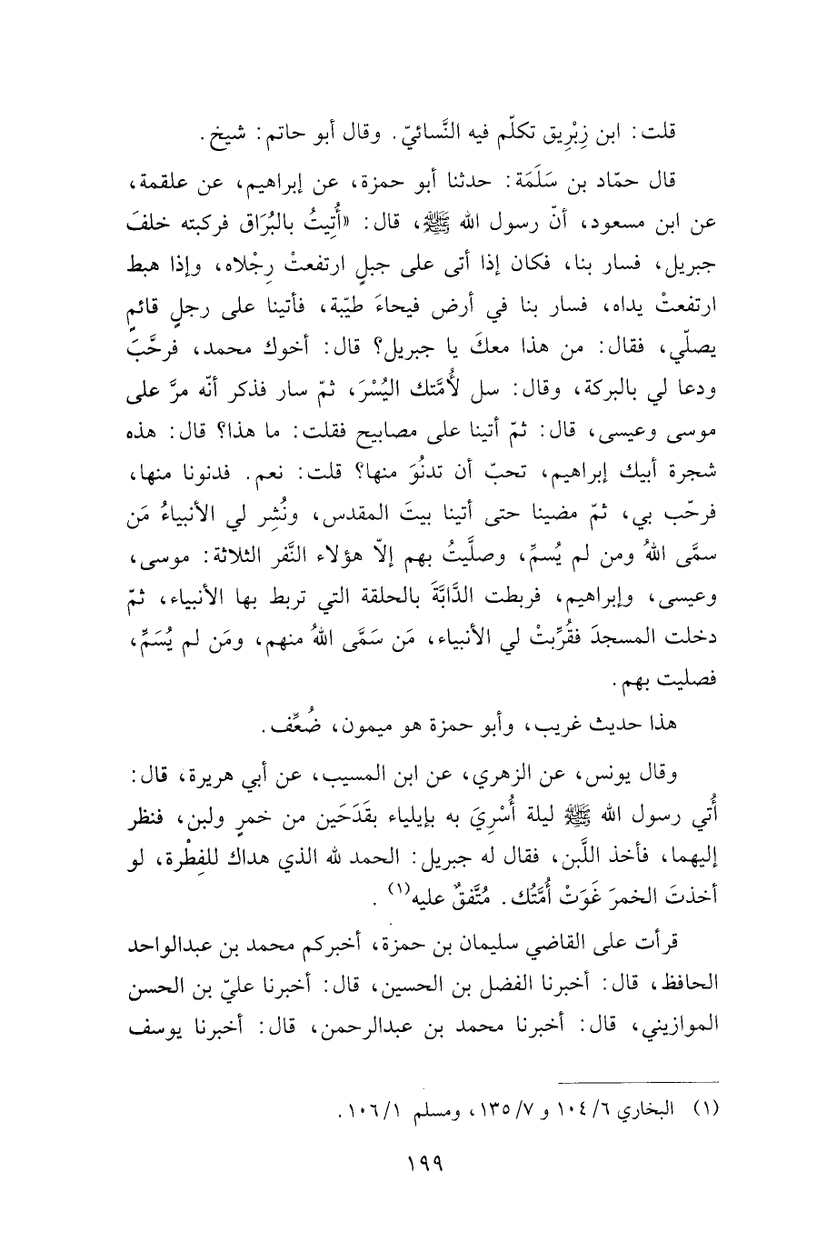 قال حماد بن سلمة: حدثنا أبو حمزة، عن إبراهيم، عن علقمة، عن ابن مسعود، أن رسول الله صلى الله عليه وسلم، قال: "أتيت بالبراق فركبته خلف جبريل، فسار بنا، فكان إذا أتى على جبل ارتفعت رجلاه، وإذا هبط ارتفعت يداه، فسار بنا في أرض فيحاء طيبة، فأتينا على رجل قائم يصلي، فقال: من هذا معك يا جبريل؟ قال: أخوك محمد، فرحب ودعا بالبركة، وقال: سل لأمتك اليسر". ثم سار, فذكر أنه مر على موسى وعيسى، قال: "ثم أتينا على مصابيح فقلت: ما هذا؟ قال: هذه شجرة أبيك إبراهيم، تحب أن تدنو منها؟ قلت: نعم. فدنونا منها، فرحب بي، ثم مضينا حتى أتينا بيت المقدس, ونشر لي الأنبياء من سمى الله ومن لم يسم، وصليت بهم إلا هؤلاء النفر الثلاثة: موسى، وعيسى، وإبراهيم، فربطت الدابة بالحلقة التي تربط بها الأنبياء، ثم دخلت المسجد فقربت لي الأنبياء، من سمى الله منهم، ومن لم يسم، فصليت بهم".