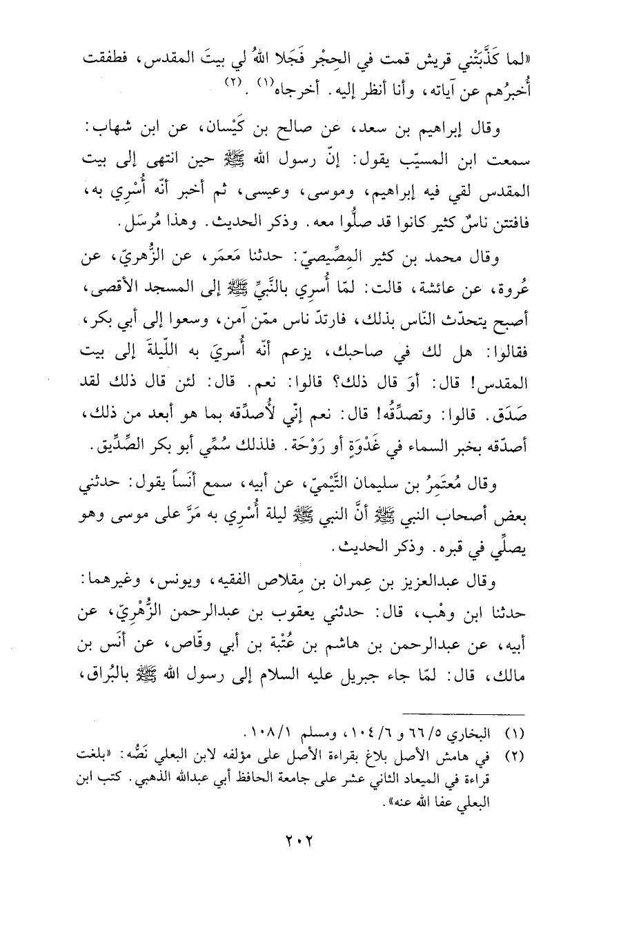 وقال إبراهيم بن سعد، عن صالح بن كيسان، عن ابن شهاب: سمعت ابن المسيب يقول: إن رسول الله صلى الله عليه وسلم حين انتهى إلى بيت المقدس لقي فيه إبراهيم وموسى، وعيسى، ثم أخبر أنه أسري به، فافتتن ناس كثير كانوا قد صلوا معه. وذكر الحديث وهذا مرسل.
