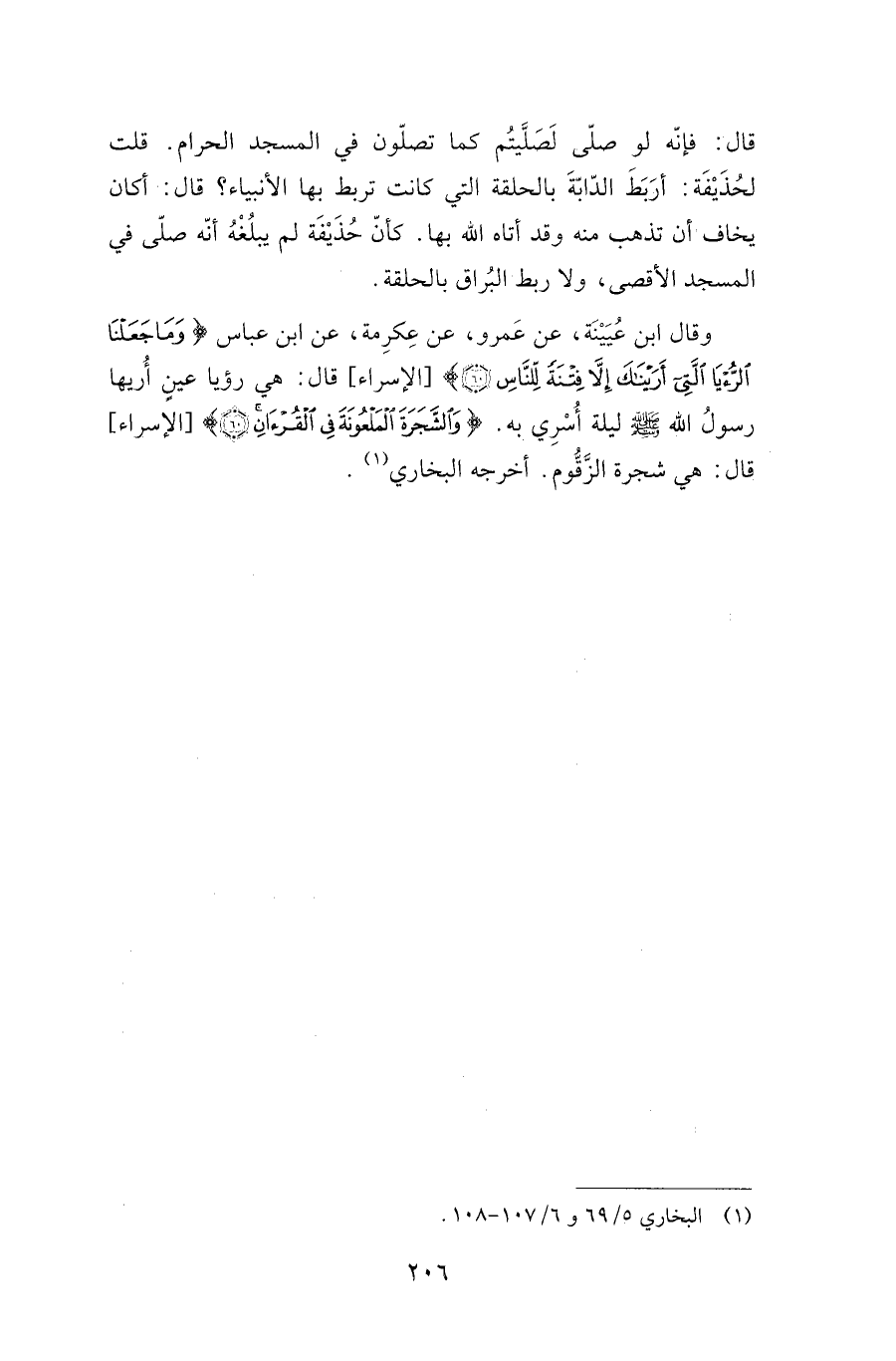 قال: فإنه لو صلى لصليتم كما تصلون في المسجد الحرام قلت: لحذيفة: أربط الدابة بالحلقة التي كانت تربط بها الأنبياء؟ قال: أكان يخاف أن تذهب منه وقد أتاه الله بها. كأن حذيفة لم يبلغه أنه صلى في المسجد الأقصى, ولا ربط البراق بالحلقة.