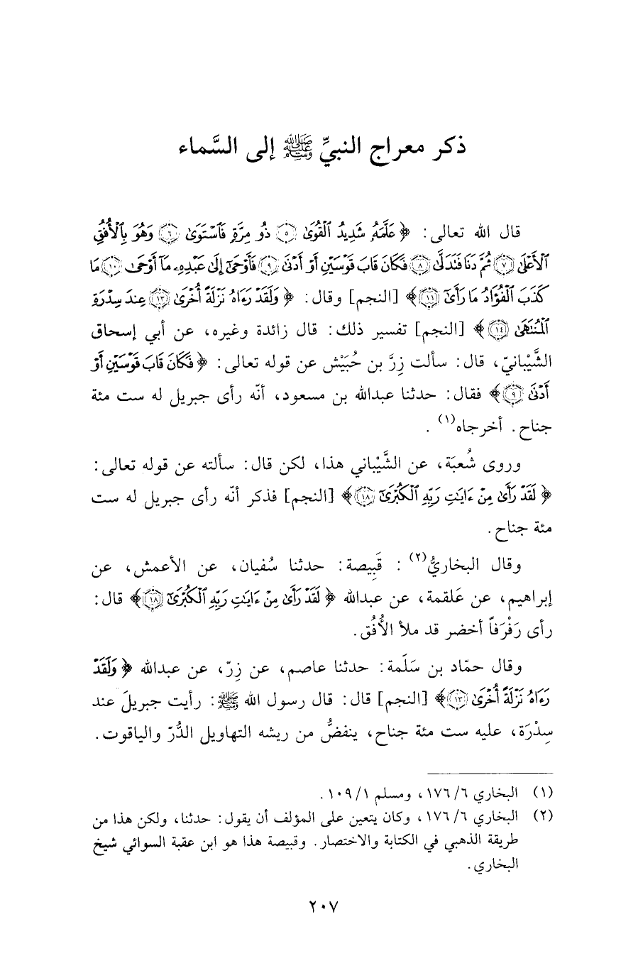 قال الله تعالى: {عَلَّمَهُ شَدِيدُ الْقُوَى، ذُو مِرَّةٍ فَاسْتَوَى، وَهُوَ بِالْأُفُقِ الْأَعْلَى، ثُمَّ دَنَا فَتَدَلَّى، فَكَانَ قَابَ قَوْسَيْنِ أَوْ أَدْنَى} [النجم: 5-11] ، وقال: {وَلَقَدْ رَآهُ نَزْلَةً أُخْرَى، عِنْدَ سِدْرَةِ الْمُنْتَهَى} [النجم: 13، 14] ، تفسير ذلك: قال زائدة وغيره، عن أبي إسحاق الشيباني، قال: سألت زر بن حبيش عن قوله تعالى: {فَكَانَ قَابَ قَوْسَيْنِ أَوْ أَدْنَى} فقال: حدثنا عبد الله بن مسعود، أنه رأى جبريل له ستمائة جناح أخرجاه.