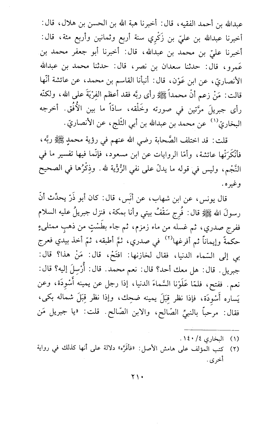 عبد الله بن أحمد الفقيه، قال: أخبرنا هبة الله بن الحسن بن هلال، قال: أخبرنا عبد الله بن علي بن زكرى سنة أربع وثمانين وأربعمائة, قال: أخبرنا علي بن محمد بن عبد الله، قال: أخبرنا أبو جعفر محمد بن عمرو، قال: حدثنا سعدان بن نصر، قال: حدثنا محمد بن عبد الله الأنصاري، عن ابن عون، قال: أنبأنا القاسم بن محمد، عن عائشة أنها قالت: من زعم أن محمدا صلى الله عليه وسلم رأى ربه فقد أعظم الفرية على الله، ولكنه رأى جبريل مرتين في صورته وخلقه، سادا ما بين الأفق. أخرجه البخاري عن محمد بن عبد الله بن أبي الثلج، عن الأنصاري.