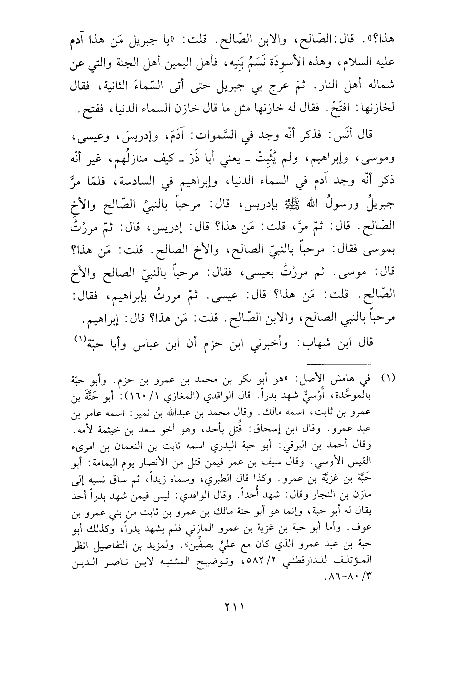 قال أنس: فذكر أنه وجد في السموات: آدم، وإدريس، وعيسى، وموسى، وإبراهيم، ولم يثبت -يعني أبا ذر- كيف منازلهم، غير أنه ذكر أنه وجد آدم في السماء الدنيا، وإبراهيم في السادسة، فلما مر جبريل ورسول الله صلى الله عليه وسلم بإدريس، قال: مرحبا بالنبي الصالح والأخ الصالح. قال: ثم مر، "قلت: من هذا؟ قال: إدريس، قال: ثم مررت بموسى فقال: مرحبا بالنبي الصالح، والأخ الصالح. قلت: من هذا؟ قال: موسى. ثم مررت بعيسى، فقال: مرحبا بالنبي الصالح والأخ الصالح. قلت: من هذا؟ قال: عيسى. ثم مررت بإبراهيم، فقال: مرحبا بالنبي الصالح، والابن الصالح. قلت: من هذا؟ قال: إبراهيم".