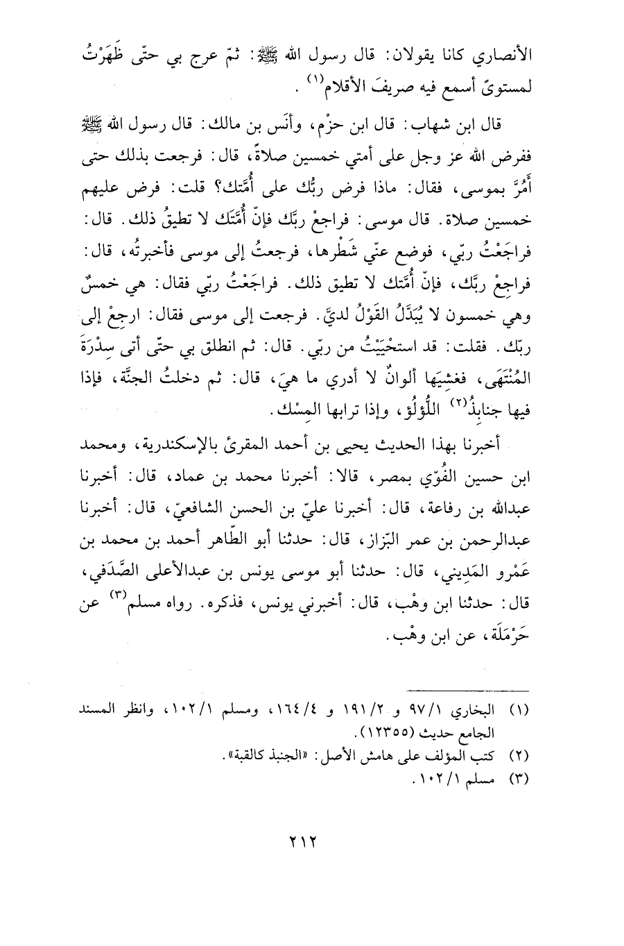 الأنصاري كانا يقولان: قال رسول الله صلى الله عليه وسلم: "ثم عرج بي حتى ظهرت لمستوى أسمع فيه صريف الأقلام".