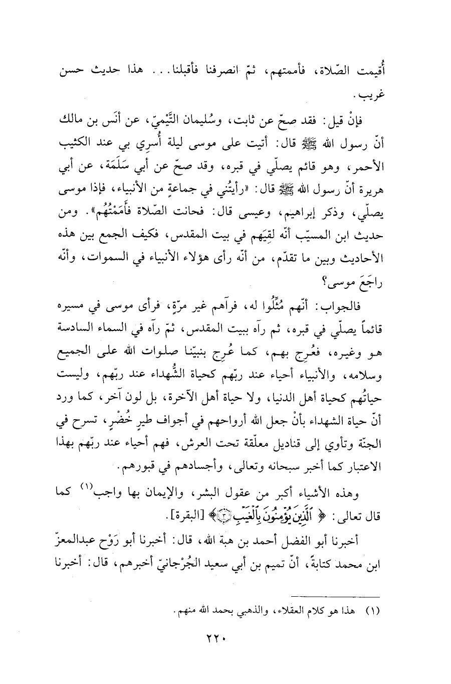 فالجواب: أنهم مثلوا له، فرآهم غير مرة، فرأى موسى في مسيرة قائما يصلي في قبره، ثم رآه ببيت المقدس، ثم رآه في السماء السادسة هو وغيره، فعرج بهم، كما عرج بنبينا صلوات الله على الجميع وسلامه، والأنبياء أحياء عند ربهم كحياة الشهداء عند ربهم، وليست حياتهم كحياة أهل الدنيا، ولا حياة أهل الآخرة، بل لون آخر، كما ورد أن حياة الشهداء بأن جعل الله أرواحهم في أجواف طير خضر، تسرح في الجنة وتأوي إلى قناديل معلقة تحت العرش، فهم أحياء عند ربهم بهذا الاعتبار كما أخبر سبحانه وتعالى، وأجسادهم في قبورهم. وهذه الأشياء أكبر من عقول البشر، والإيمان بها واجب كما قال تعالى: {الَّذِينَ يُؤْمِنُونَ بِالْغَيْبِ} [البقرة: 3] .