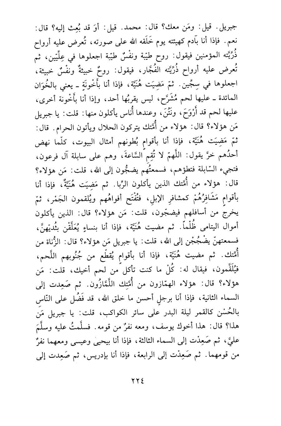ثم مضيت هنيهة، فإذا أنا بأخونة - يعني بالخوان المائدة- عليها لحم مشرح، ليس يقربها أحد، وإذا أنا بأخونة أخرى، عليها لحم قد أروح، ونتن، وعندها أناس يأكلون منها: قلت: يا جبريل من هؤلاء؟ قال: هؤلاء من أمتك يتركون الحلال ويأتون الحرام. قال: ثم مضيت هنيهة، فإذا أنا بأقوام بطونهم أمثال البيوت، كلما نهض أحدهم خر يقول: اللهم لا تقم الساعة، وهم على سابلة آل فرعون، فتجيء السابلة فتطؤهم، فسمتهم يضجون إلى الله، قلت: من هؤلاء؟ قال: هؤلاء من أمتك الذين يأكلون الربا. ثم مضيت هنيهة، فإذا أنا بأقوام مشافرهم كمشافر الإبل، فتفتح أفواههم ويلقمون الجمر، ثم يخرج من أسافلهم فيضجون، قلت: من هؤلاء؟ قال: الذين يأكلون أموال اليتامى ظلما. ثم مضيت هنيهة، فإذا أنا بنساء يعلقن بثديهن، فسمعتهن يضججن إلى الله، قلت: يا جبريل من هؤلاء؟ قال: الزناة من أمتك. ثم مضيت هنيهة، فإذا أنا بأقوام يقطع من جنوبهم اللحم، فيلقمون، فيقال له: كل ما كنت تأكل من لحم أخيك، قلت: من هؤلاء؟ قال: هؤلاء الهمازون من أمتك اللمازون. ثم صعدت إلى السماء الثانية فإذا أنا برجل أحسن ما خلق الله، قد فضل على الناس بالحسن كالقمر ليلة البدر على سائر الكواكب، قلت: يا جبريل من هذا؟ قال: هذا أخوك يوسف، ومعه نفر من قومه. فسلمت عليه وسلم علي، ثم صعدت إلى السماء الثالثة، فإذا أنا بيحيى وعيسى ومعهما نفر من قومهما. ثم صعدت إلى الرابعة، فإذا أنا بإدريس، ثم صعدت إلى