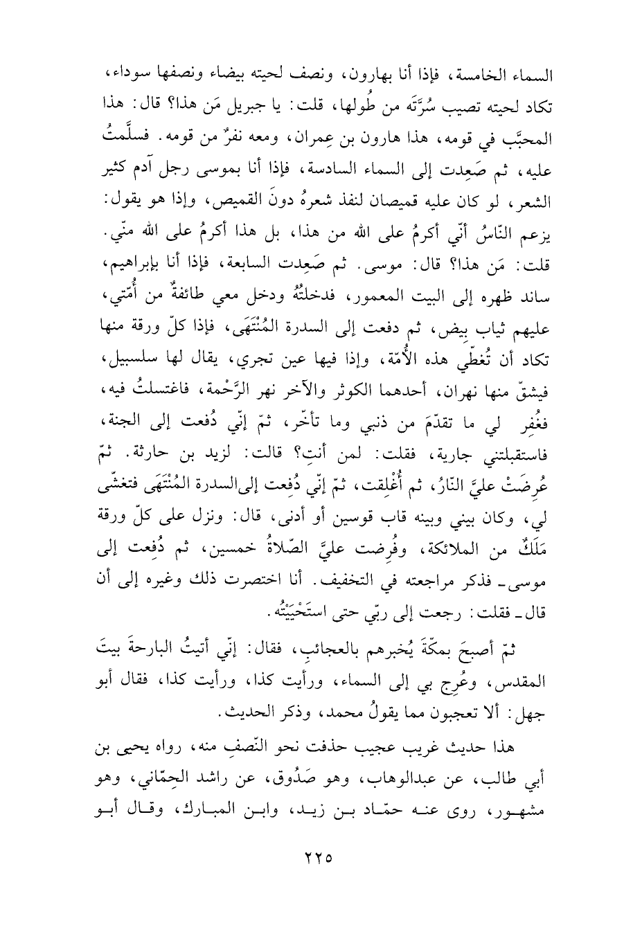 السماء الخامسة، فإذا أنا بهارون ونصف لحيته بيضاء ونصفها سوداء، تكاد لحيته تصيب سرته من طولها، قلت: يا جبريل من هذا؟ قال: هذا المحبب في قومه، هذا هارون بن عمران، ومعه نفر من قومه. فسلمت عليه، ثم صعدت إلى السماء السادسة، فإذا أنا بموسى رجل آدم كثير الشعر، لو كان عليه قميصان لنفذ شعره دون القميص، وإذا هو يقول: يزعم الناس أني أكرم على الله من هذا، بل هذا أكرم على الله مني. قلت: من هذا؟ قال: موسى