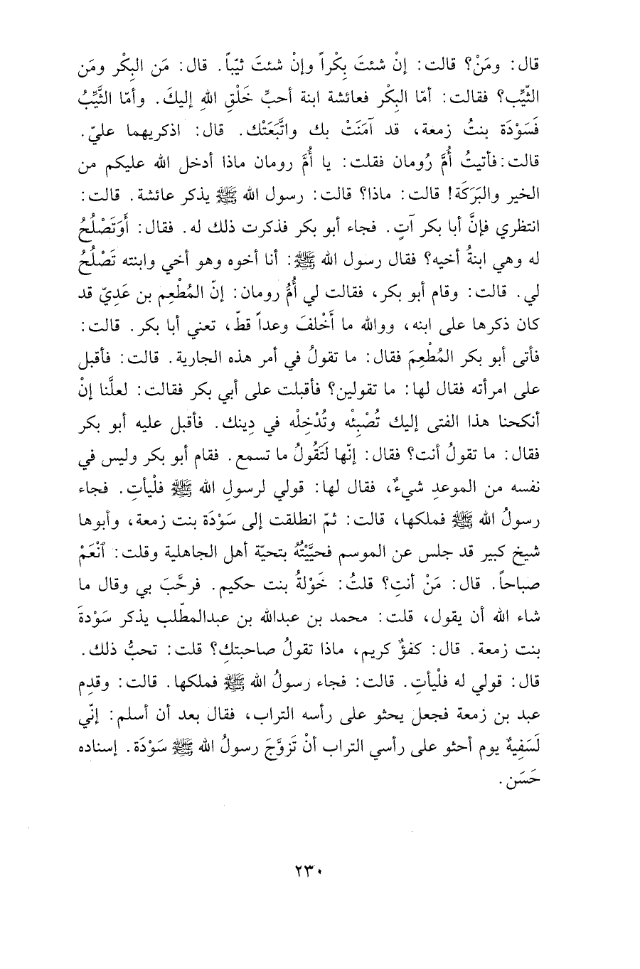 فأقبل على امرأته فقال لها: ما تقولين؟ فأقبلت على أبي بكر فقالت: لعلنا إن أنكحنا هذا الفتى إليك تصبئه وتدخله في دينك. فأقبل عليه أبو بكر فقال: ما تقول أنت؟ فقال: إنها لتقول ما تسمع. فقام أبو بكر وليس في نفسه من الموعد شيء، فقال لها: قولي لرسول الله صلى الله عليه وسلم فليأت. فجاء رسول الله صلى الله عليه وسلم فملكها، قالت: ثم انطلقت إلى سودة بنت زمعة، وأبوها شيخ كبير قد جلس عن الموسم فحييته بتحية أهل الجاهلية وقلت: أنعم صباحا. قال: من أنت؟ قلت: خولة بنت حكيم. فرحب بي وقال ما شاء الله أن يقول، قلت: محمد بن عبد الله بن عبد المطلب يذكر سودة بنت زمعة. قال: كفؤ كريم، ماذا تقول صاحبتك؟ قلت: تحب ذلك. قال: قولي له فليأت. قالت فجاء رسول الله صلى الله عليه وسلم فملكها. قالت: وقدم عبد بن زمعة فجعل يحثو على رأسه التراب، فقال بعد أن أسلم: إني لسفيه يوم أحثو على رأسي التراب أن تزوج رسول الله صلى الله عليه وسلم سودة. إسناده حسن.