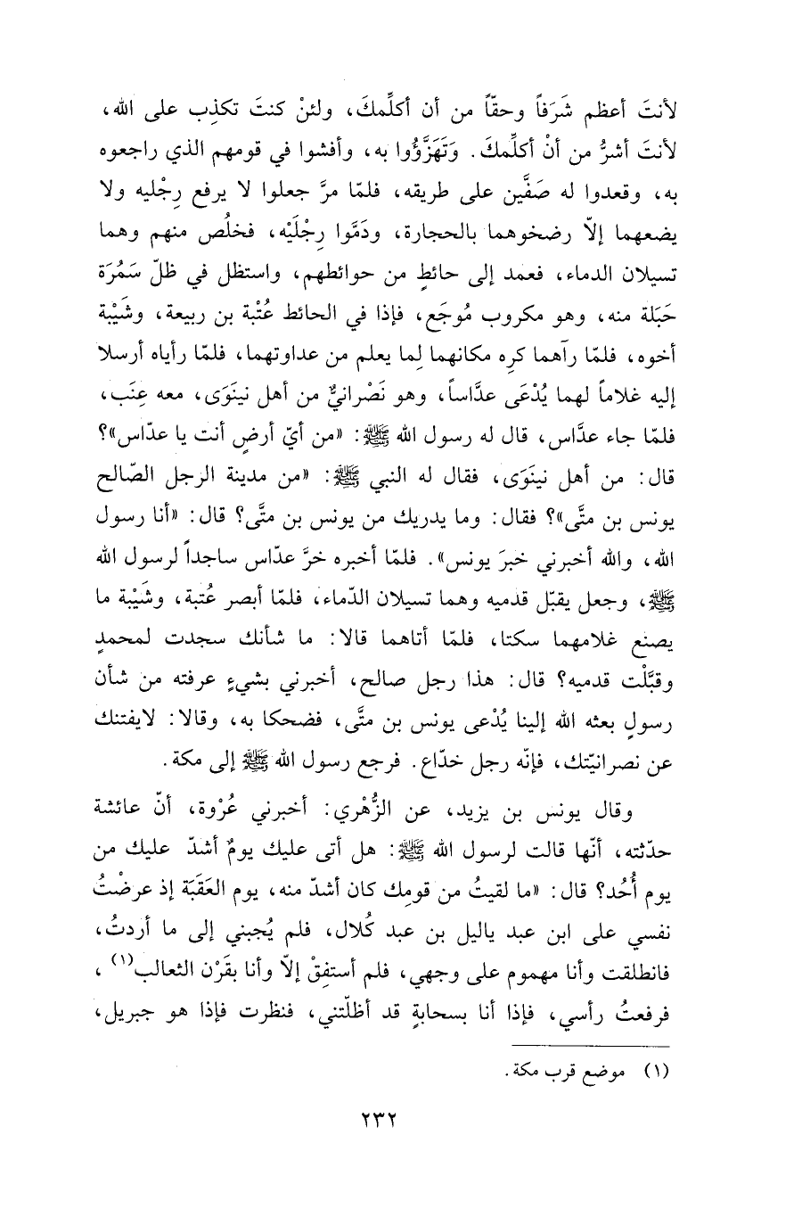 لرسول الله صلى الله عليه وسلم، وجعل يقبل قدميه وهما تسيلان الدماء، فلما أبصر عتبة، وشيبة ما يصنع غلامهما سكتا، فلما أتاهما قالا: ما شأنك سجدت لمحمد وقبلت قدميه؟ قال: هذا رجل صالح، أخبرني بشيء عرفته من شأن رسول بعثه الله إلينا يدعى يونس بن متى، فضحكا به، وقالا: لا يفتنك عن نصرانيتك، فإنه رجل خداع. فرجع رسول الله صلى الله عليه وسلم إلى مكة.