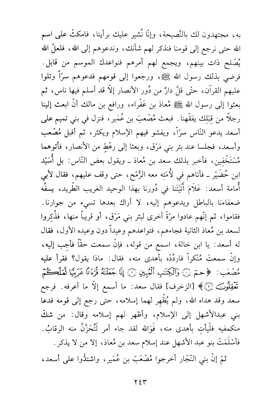 عَرَبِيًّا لَعَلَّكُمْ تَعْقِلُونَ} [الزخرف: 1-3] ، فقال سعد: ما أسمع إلا ما أعرفه. فرجع سعد وقد هداه الله، ولم يظهر لهما إسلامه، حتى رجع إلى قومه فدعا بني عبد الأشهل إلى الإسلام، وأظهر لهم إسلامه وقال: من شك منكم فيه فليأت بأهدى منه، فوالله لقد جاء أمر لتحزَّنَّ منه الرقاب. فأسلمت بنو عبد الأشهل عند إسلام سعد بن معاذ، إلا من لا يذكر.