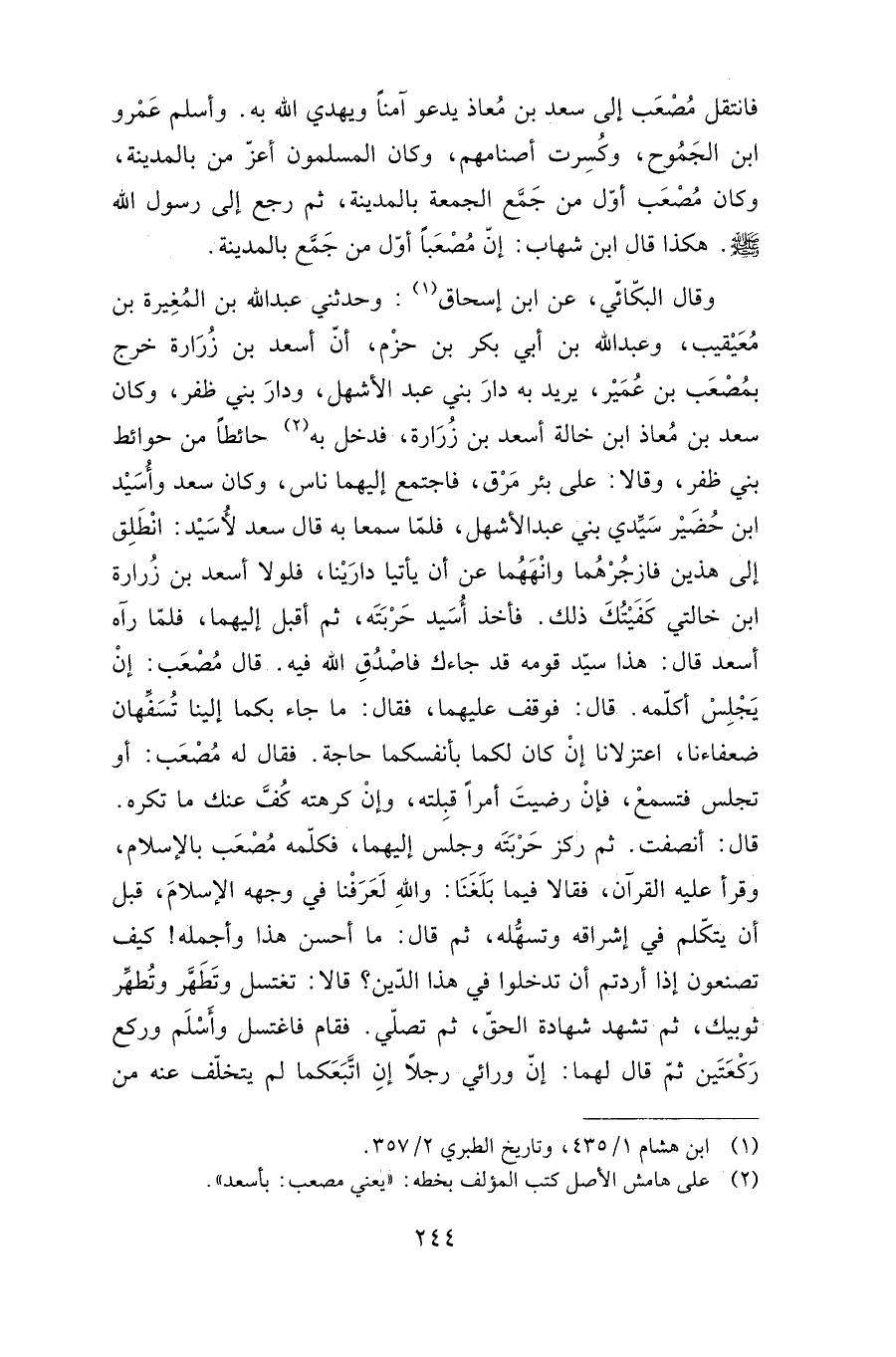 وقال البكائي، عن ابن إسحاق: وحدثني عبد الله بن المغيرة بن معيقيب، وعبد الله بن أبي بكر بن حزم، أن أسعد بن زرارة خرج بمصعب بن عمير، يريد به دار بني عبد الأشهل، ودار بني ظفر، وكان سعد بن معاذ ابن خالة أسعد بن زرارة، فدخل به حائطا من حوائط بني ظفر، وقالا: على بئر مرق، فاجتمع إليهما ناس، وكان سعد وأسيد بن حضير سيدي بني عبد الأشهل، فلما سمعا به قال سعد لأسيد: انطلق إلى هذين فازجرهما وانههما عن أن يأتيا دارينا، فلولا، أسعد بن زرارة ابن خالتي كفيتك ذلك. فأخذ أسيد حربته، ثم أقبل إليهما، فلما رآه أسعد قال: هذا سيد قومه قد جاءك فاصدق الله فيه. قال مصعب: إن يجلس أكلمه. قال: فوقف عليهما، فقال: ما جاء بكما إلينا تسفهان ضعفاءنا، اعتزلانا إن كان لكما بأنفسكما حاجة، فقال له مصعب: أو تجلس فتسمع، فإن رضيت أمرا قبلته، وإن كرهته كف عنك ما تكره. قال: أنصف. ثم ركز حربته وجلس إليهما، فكلمه مصعب بالإسلام، وقرأ عليه القرآن، فقالا فيما بلغنا: والله لعرفنا في وجه الإسلام، قبل أن يتكلم في إشراقه وتسهله، ثم قال: ما أحسن هذا وأجمله! كيف تصنعون إذا أردتم أن تدخلوا في هذا الدين؟ قالا: تغتسل وتطهر وتطهر ثوبيك، ثم تشهد شهادة الحق، ثم تصلي. فقام فاغتسل وأسلم وركع ركعتين ثم قال لهما: إن ورائي رجلا إن اتبعكما لم يتخلف عنه من