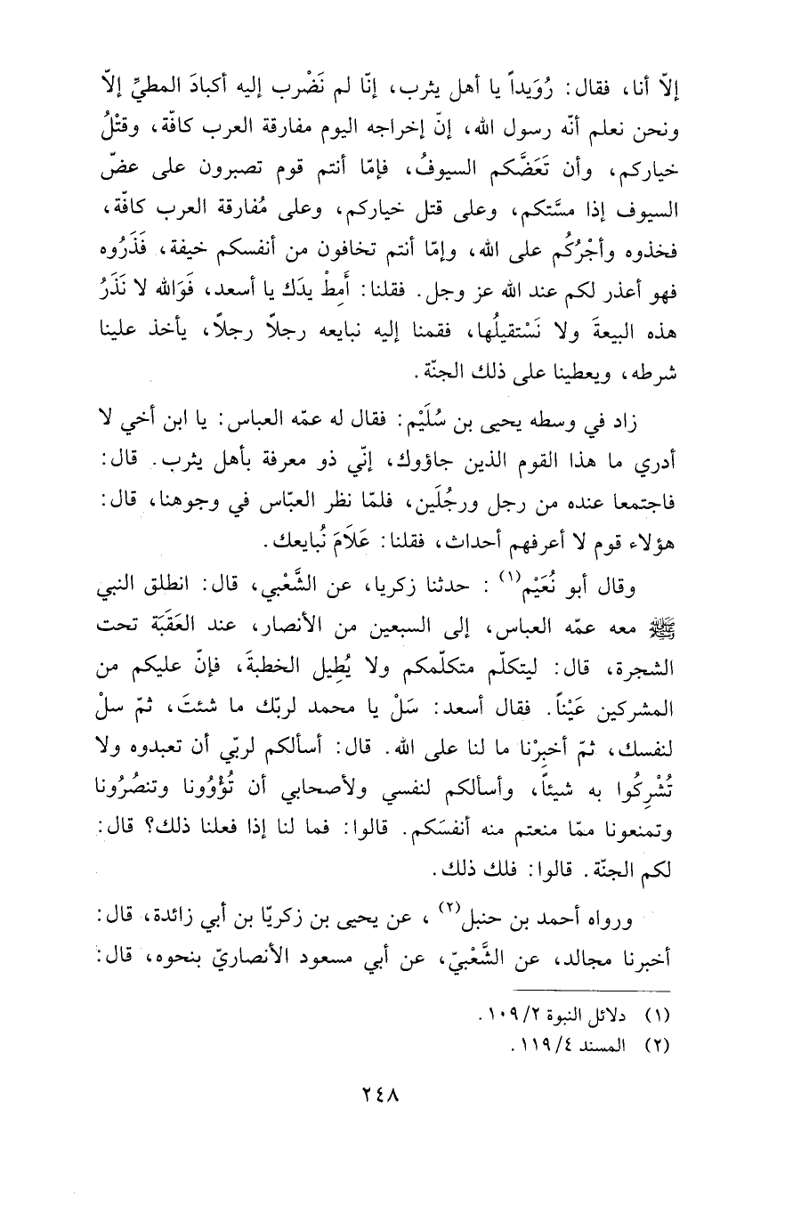 إلا أنا، فقال: رويدا يا أهل يثرب، إنا لم نضرب إليه أكباد المطي إلا ونحن نعلم أنه رسول الله، إن إخراجه اليوم مفارقة العرب كافة، وقتل خياركم، وأن تعضكم السيوف، فإما أنتم قوم تصبرون على عض السيوف إذا مستكم، وعلى قتل خياركم، وعلى مفارقة العرب كافة، فخذوه وأجركم على الله، وإما أنتم تخافون من أنفسكم خيفة، فذروه فهو أعذر لكم عند الله عز وجل. قلنا: أمط يدك يا أسعد، فوالله لا نذر هذه البيعة ولا نستقيلها، فقمنا إليه نبايعه رجلا رجلا، يأخذ علينا شرطه، ويعطينا على ذلك الجنة.