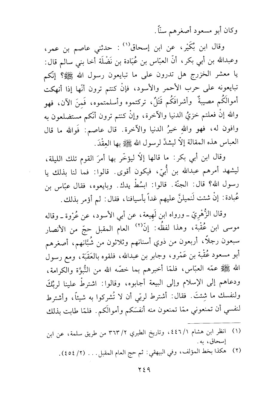 وقال الزهري -ورواه ابن لهيعة، عن أبي الأسود، عن عروة- وقاله موسى بن عقبة، وهذا لفظه: إن العام المقبل حج من الأنصار سبعون رجلا، أربعون من ذوي أسنانهم وثلاثون من شبانهم، أصغرهم أبو مسعود عقبة بن عمرو، وجابر بن عبد الله، فلقوه بالعقبة، ومع رسول الله صلى الله عليه وسلم عمه العباس، فلما أخبرهم بما خصه الله من النبوة والكرامة، ودعاهم إلى الإسلام وإلى البيعة أجابوه، وقالوا: اشترط علينا لربك ولنفسك ما شئت. فقال: "أشترط لربي أن لا تشركوا به شيئا، وأشترط لنفسي أن تمنعوني مما تمنعون منه أنفسكم وأموالكم". فلما طابت بذلك
