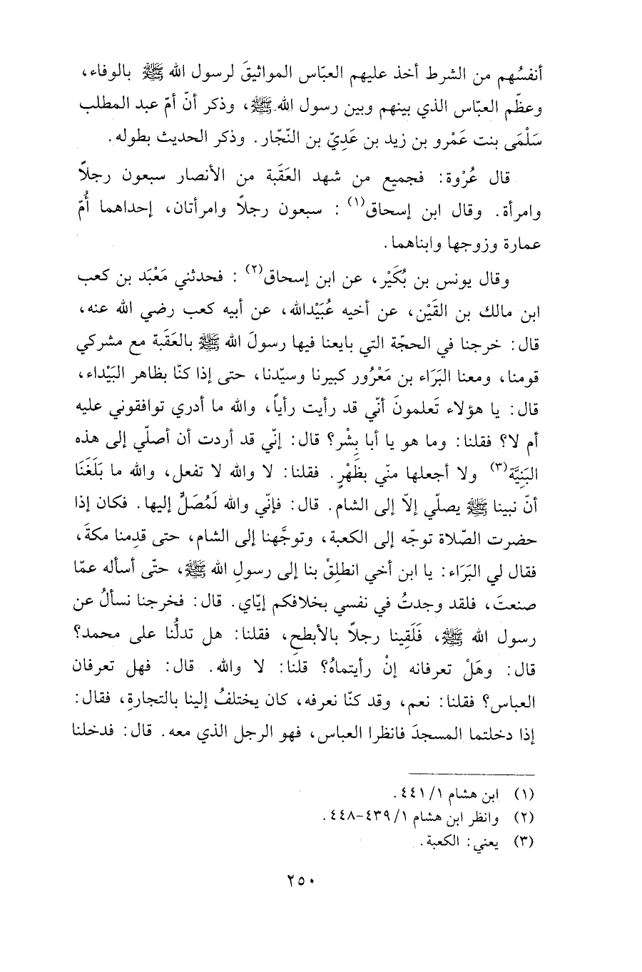 وقال يونس بن بكير، عن ابن إسحاق: فحدثني معبد بن كعب بن مالك بن القين، عن أخيه عبيد الله، عن أبيه كعب رضي الله عنه قال: خرجنا في الحجة التي بايعنا فيها رسول الله صلى الله عليه وسلم بالعقبة مع مشركي قومنا، ومعنا البراء بن معرور كبيرنا وسيدنا، حتى إذا كنا بظاهر البيداء، قال: يا هؤلاء تعلمون أني قد رأيت رأيا، والله ما أدري توافقوني عليه أم لا؟ فقلنا: وما هو يا أبا بشر؟ قال: إني قد أردت أن أصلي إلى هذه البنية ولا أجعلها مني بظهر. فقلنا: لا والله لا تفعل، والله ما بلغنا أن نبينا صلى الله عليه وسلم يصلي إلا إلى الشام. قال: فإني والله لمصل إليها. فكان إذا حضرت الصلاة توجه إلى الكعبة، وتوجهنا إلى الشام, حتى قدمنا مكة، فقال لي البراء: يابن أخي انطلق بنا إلى رسول الله صلى الله عليه وسلم، حتى أسأله عما صنعت، فلقد وجدت في نفسي بخلافكم إياي. قال: فخرجنا نسأل عن رسول الله صلى الله عليبه وسلم فلقينا رجلا بالأبطح، فقلنا: هل تدلنا على محمد؟ قال: وهل تعرفانه إن رأيتماه؟ قلنا: لا والله. قال: فهل تعرفان العباس؟ فقلنا: نعم، وقد كنا نعرفه، كان يختلف إلينا بالتجارة، فقال: إذا دخلتما المسجد فانظرا العباس، فهو الرجل الذي معه. قال: فدخلنا