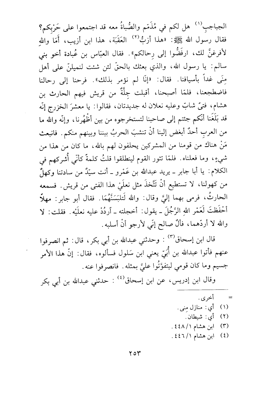 الجباجب هل لكم من مذمم والصباة معه قد اجتمعوا على حربكم؟ فقال رسول الله صلى الله عليه وسلم: "هذا أزب العقبة، هذا ابن أزيب، أما والله لأفرغن لك، ارفضوا إلى رحالكم". فقال العباس بن عبادة أخو بني سالم: يا رسول الله، والذي بعثك بالحق لئن شئت لنميلن على أهل منى غدا بأسيافنا. فقال: "إنا لم نؤمر بذلك" فرحنا إلى رحالنا فاضطجعنا، فلما أصبحنا، أقبلت جلة من قريش فيهم الحارث بن هشام، فتى شاب وعليه نعلان له جديدتان، فقالوا: يا معشر الخزرج إنه قد بلغنا أنكم جئتم إلى صاحبنا لتستخرجوه من بين أظهرنا، وإنه والله ما من العرب أحد أبغض