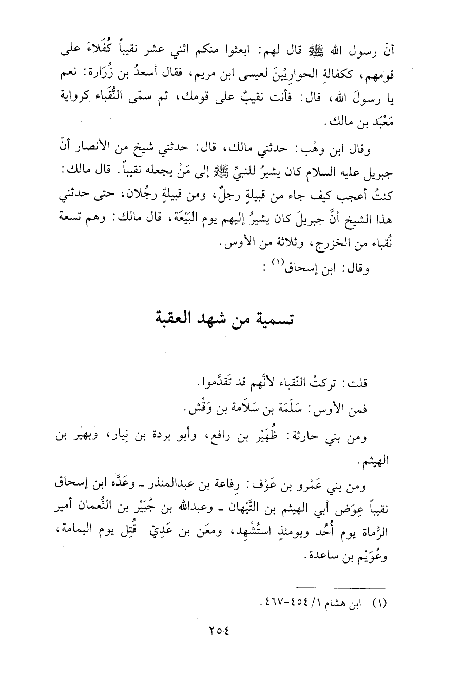 وقال ابن وهب: حدثني مالك، قال: حدثني شيخ من الأنصار أن جبريل -عليه السلام- كان يشير للنبي صلى الله عليه وسلم إلى من يجعله نقيبا. قال مالك: كنت أعجب كيف جاء من قبيلة رجل، ومن قبيلة رجلان، حتى حدثني هذا الشيخ أن جبريل كان يشير إليهم يوم البيعة، قال مالك: وهم تسعة نقباء من الخزرج، وثلاثة من الأوس.
