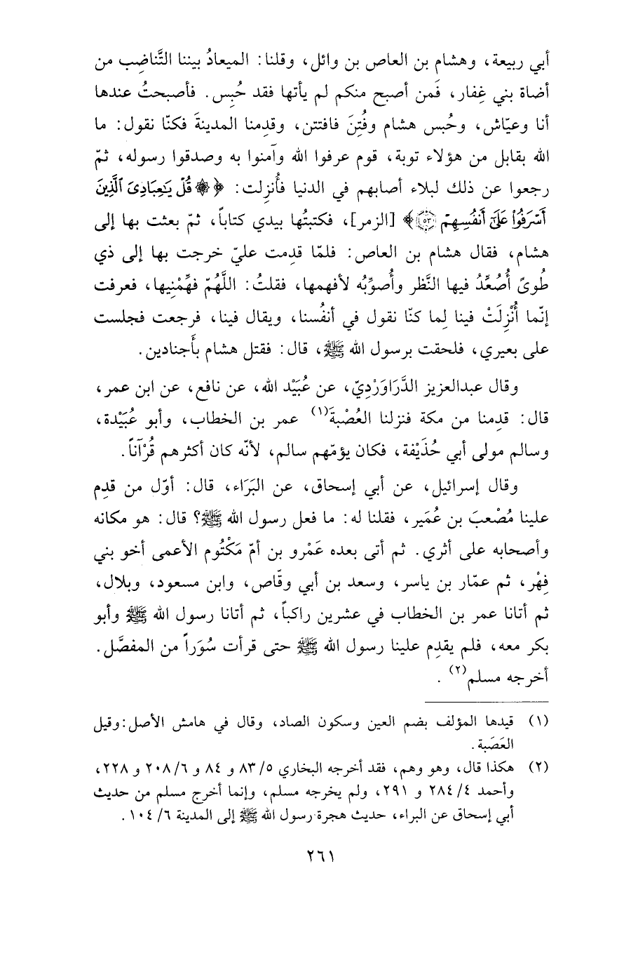 أبي ربيعة، وهشام بن العاص بن وائل، وقلنا: الميعاد بيننا التناضب من أضاة بني غفار، فمن أصبح منكم لم يأتها فقد حبس. فأصبحت عندها أنا وعياش، وحبس هشام وفتن فافتتن وقدمنا المدينة فكنا نقول: ما الله بقابل من هؤلاء توبة, قوم عرفوا الله وآمنوا به وصدقوا رسوله، ثم رجعوا عن ذلك لبلاء أصابهم في الدنيا فأنزلت: {قُلْ يَا عِبَادِيَ الَّذِينَ أَسْرَفُوا عَلَى أَنْفُسِهِمْ} [الزمر: 53] ، فكتبتها بيدي كتابا، ثم بعثت بها إلى هشام، فقال هشام بن العاص: فلما قدمت عليَّ خرجت بها إلى ذي طوى أصعد فيها النظر وأصوِّبه لأفهمها، فقلت: اللهم فهمنيها، فعرفت إنما أنزلت فينا لما كنا نقول في أنفسنا، ويقال فينا، فرجعت فجلست على بعيري، فلحقت برسول الله صلى الله عليه وسلم، قال: فقتل هشام بأجنادين.