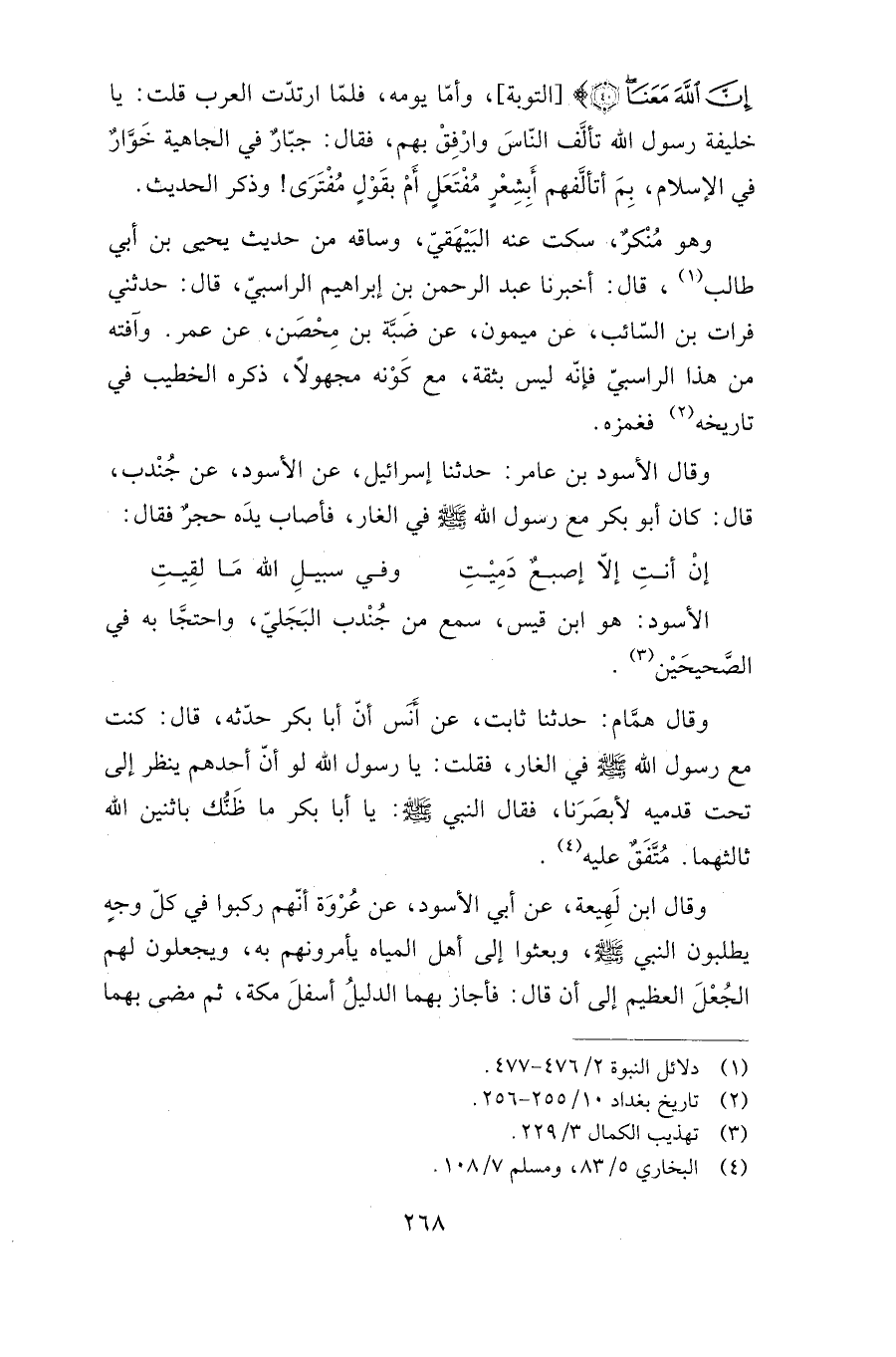 وقال همام: حدثنا ثابت، عن أنس أن أبا بكر حدثه، قال: كنت مع رسول الله صلى الله عليه وسلم في الغار، فقلت: يا رسول الله لو أن أحدهم ينظر إلى تحت قدميه لأبصرنا، فقال النبي صلى الله عليه وسلم: "يا أبا بكر ما ظنك باثنين الله ثالثهما". متفق عليه.