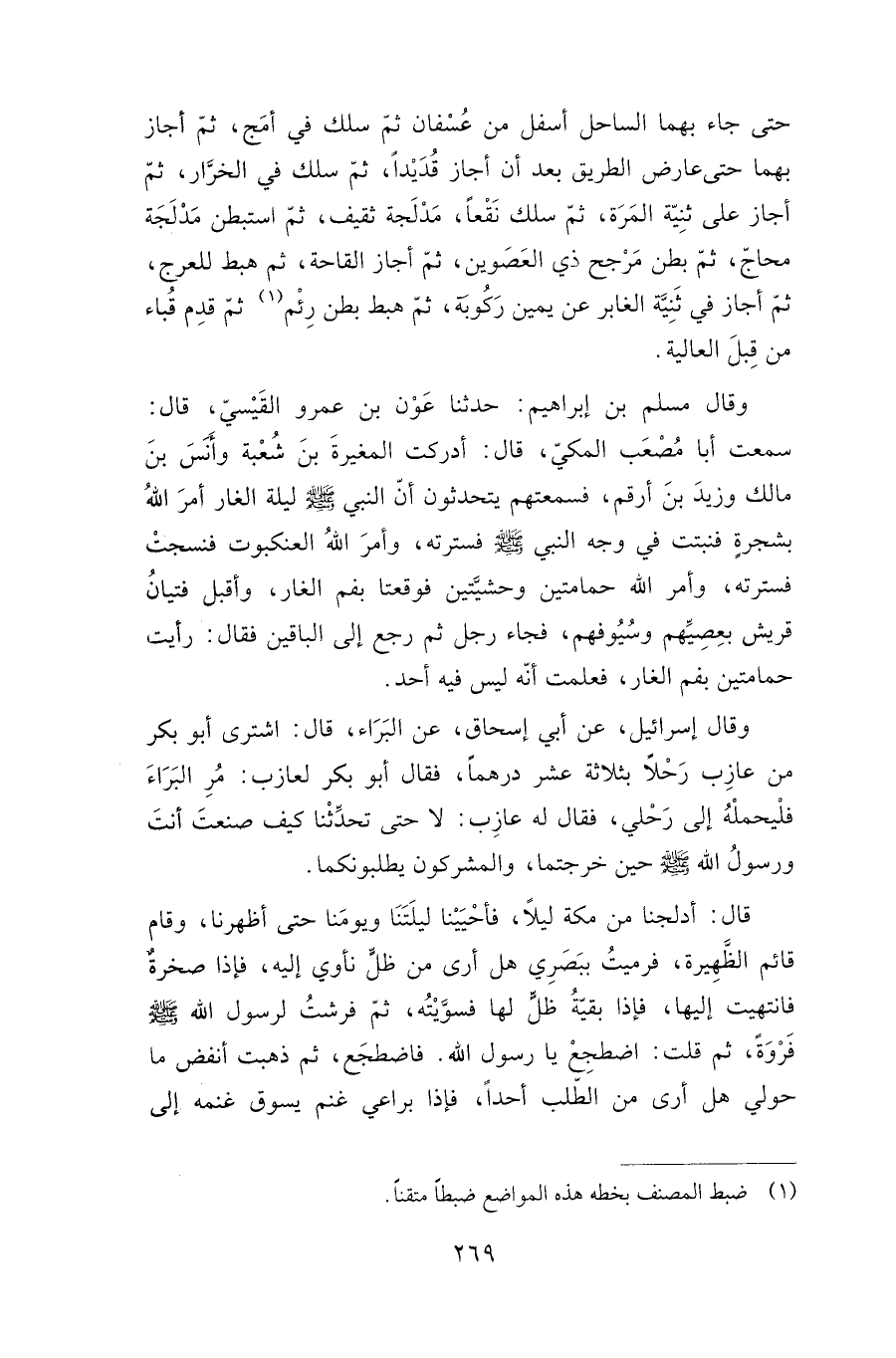 فرشت لرسول الله صلى الله عليه وسلم فروة، ثم قلت: اضطجع يا رسول الله. فاضطجع, ثم ذهبت أنفض ما حولي هل أرى من الطلب أحدا، فإذا براعي غنم يسوق غنمه إلى