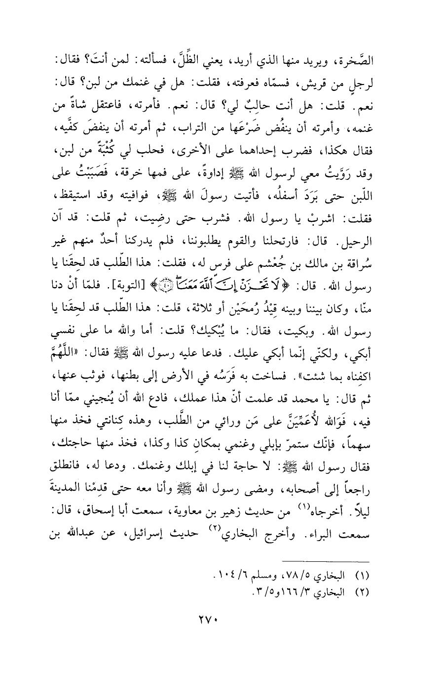 الصخرة, ويريد منها الذي أريد، يعني الظل، فسألته: لمن أنت؟ فقال: لرجل من قريش، فسماه فعرفته، فقلت: هل في غنمك من لبن؟ قال: نعم. قلت: هل أنت حالب لي؟ قال: نعم. فأمرته، فاعتقل شاة من غنمه، وأمرته أن ينفض ضرعها من التراب، ثم أمرته أن ينفض كفيه، فقال هكذا، فضرب إحداهما على الأخرى، فحلب لي كثبة من لبن، وقد رويت معي لرسول الله صلى الله عليه وسلم إداوة، على فمها خرقة، فصببت على اللبن حتى برد أسفله، فأتيت رسول الله صلى الله عليه وسلم، فوافيته وقد استيقظ، فقلت: اشرب يا رسول الله. فشرب حتى رضيت، ثم قلت: قد آن الرحيل. قال: فارتحلنا والقوم يطلبوننا، فلم يدركنا أحد منهم غير سراقة بن مالك بن جعشم على فرس له، فقلت: هذا الطلب قد لحقنا يا رسول الله. قال: {لا تَحْزَنْ إِنَّ اللَّهَ مَعَنَا} [التوبة: 40] ، فلما أن دنا منا، وكان بيننا وبينه قيد رمحين أو ثلاثة، قلت: هذا الطلب قد لحقنا يا رسول الله. وبكيت، فقال: "ما يبكيك"؟ قلت: أما والله ما على نفسي أبكي، ولكني إنما أبكي عليك. فدعا عليه رسول الله صلى الله عليه وسلم فقال: "اللهم اكفناه بما شئت". فساخت به فرسه في الأرض إلى بطنها، فوثب عنها، ثم قال: يا محمد قد علمت أن هذا عملك، فادع الله أن ينجيني مما أنا فيه، فوالله لأعمين على من ورائي من الطلب، وهذه كنانتي فخذ منها سهما، فإنك ستمر بإبلي وغنمي بمكان كذا وكذا، فخذ منها حاجتك، فقال رسول الله صلى الله عليه وسلم: "لا حاجة لنا في إبلك وغنمك". ودعا له، فانطلق راجعا إلى أصحابه، ومضى رسول الله صلى الله عليه وسلم وأنا معه حتى قدمنا المدينة ليلا. أخرجاه من حديث زهير بن معاوية، سمعت أبا إسحاق، قال سمعت البراء. وأخرج البخاري حديث إسرائيل، عن عبد الله بن