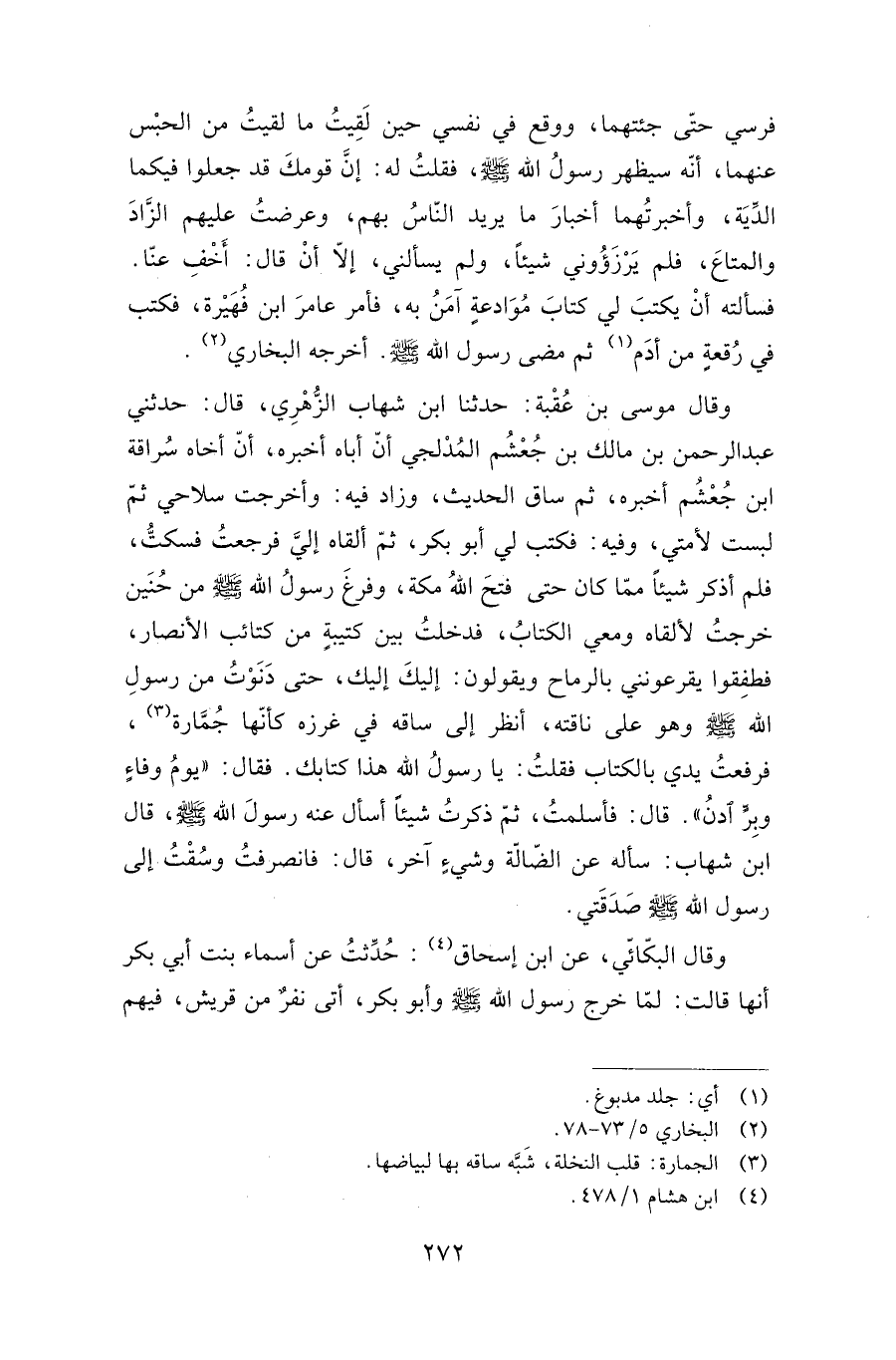 فرسي حتى جئتهما، ووقع في نفسي حين لقيت ما لقيت من الحبس عنهما، أنه سيظهر رسول الله صلى الله عليه وسلم، فقلت له: إن قومك قد جعلوا فيكما الدية، وأخبرتهما أخبار ما يريد الناس بهم، وعرضت عليهم الزاد والمتاع، فلم يرزءوني شيئا، ولم يسألني، إلا أن قال: "أخف عنا". فسألته أن يكتب لي كتاب موادعة آمن به، فأمر عامر بن فهيرة، فكتب في رقعة من أدم مضى رسول الله صلى الله عليه وسلم. أخرجه البخاري.