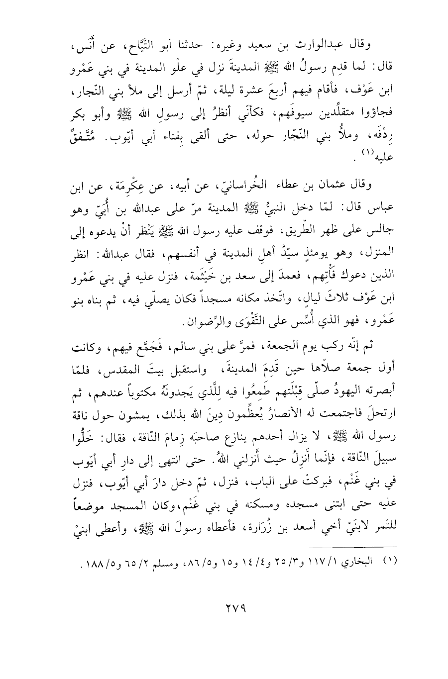 رسول الله صلى الله عليه وسلم المدينة نزل في علوم المدينة في بني عمرو بن عوف، فأقام فيهم أربع عشرة ليلة، ثم أرسل إلى ملأ بني النجار، فجاءوا متقلدين سيوفهم، فكأني أنظر إلى رسول الله صلى الله عليه وسلم وأبو بكر ردفه، وملأ بني النجار حوله، حتى ألقى بفناء أبي أيوب. متفق عليه.