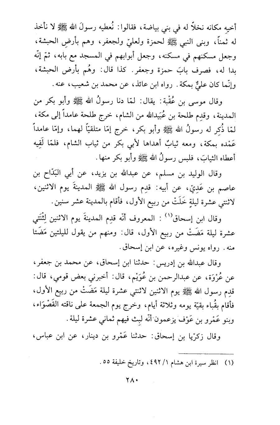 وقال ابن إسحاق: المعروف أنه قدم المدينة يوم الإثنين لثنتي عشرة ليلة مضت من ربيع الأول، قال: ومنهم من يقول لليلتين مضتا منه. رواه يونس وغيره، عن ابن إسحاق.