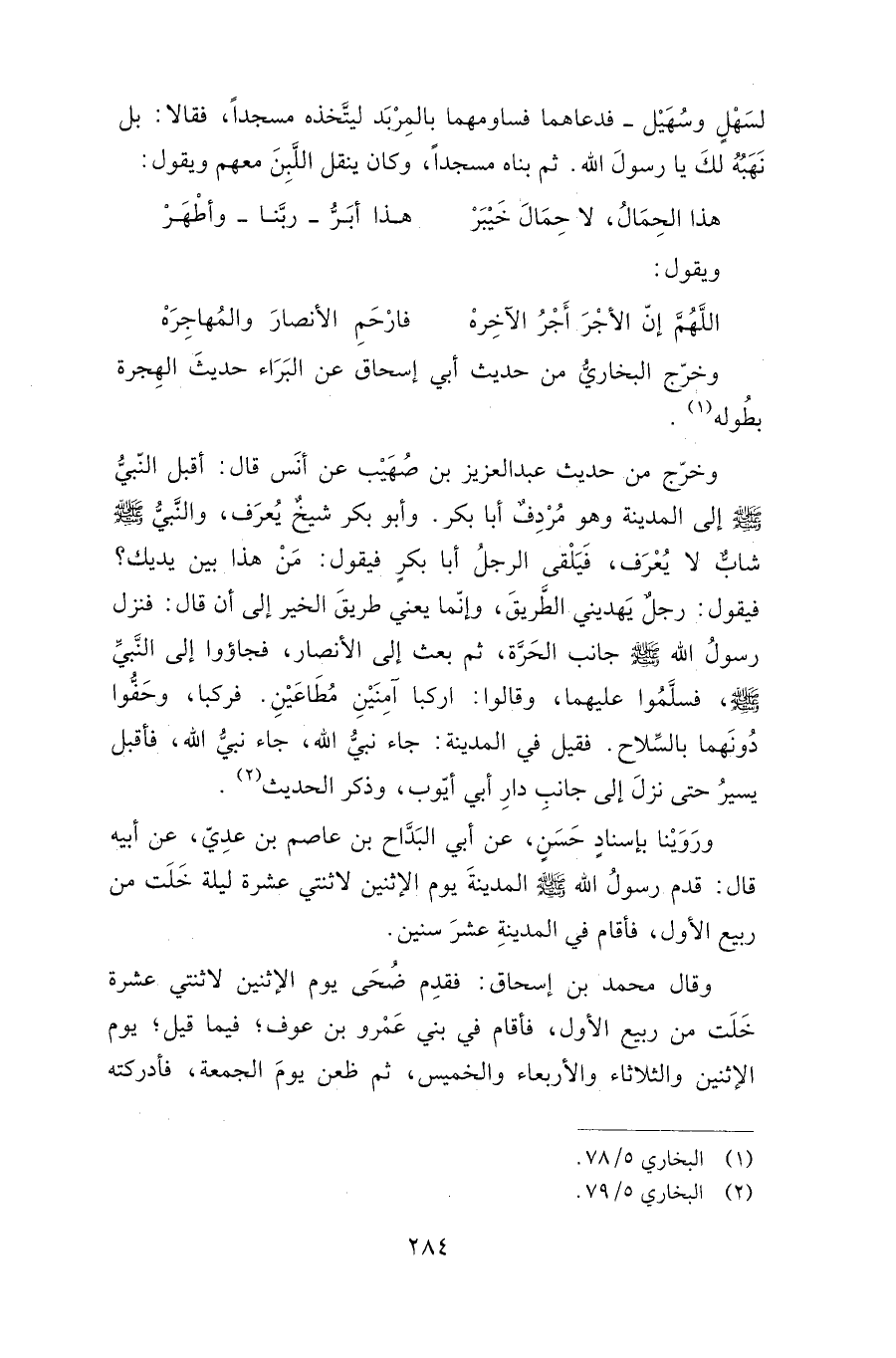 لسهل وسهيل- فدعاهما فساومهما بالمربد ليتخذه مسجدا، فقالا: بل نهبه لك يا رسول الله. ثم بناه مسجدا، وكان ينقل اللبن معهم ويقول: