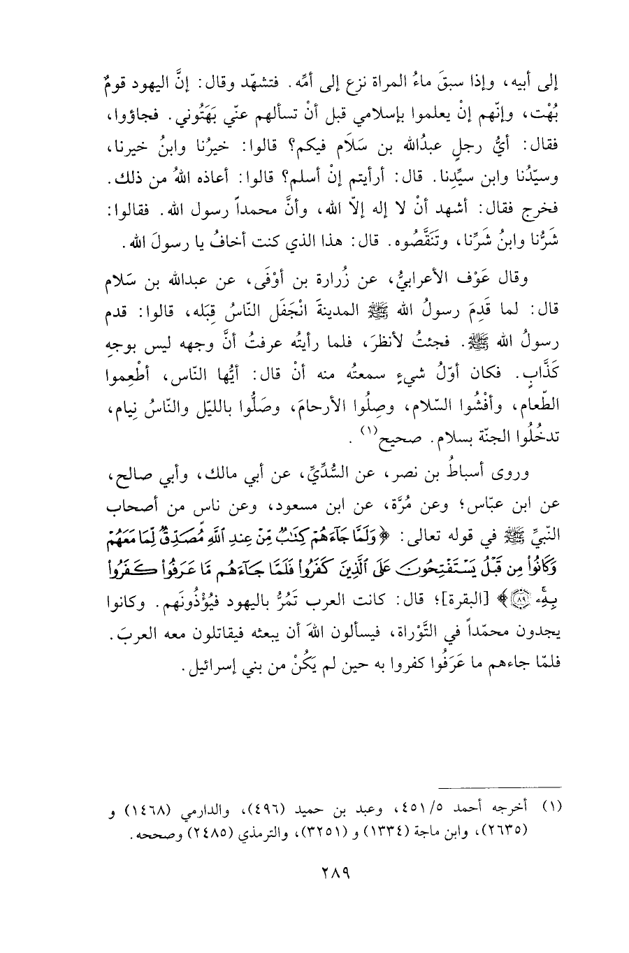وقال عوف الأعرابي، عن زرارة بن أوفى، عن عبد الله بن سلام قال: لما قدم رسول