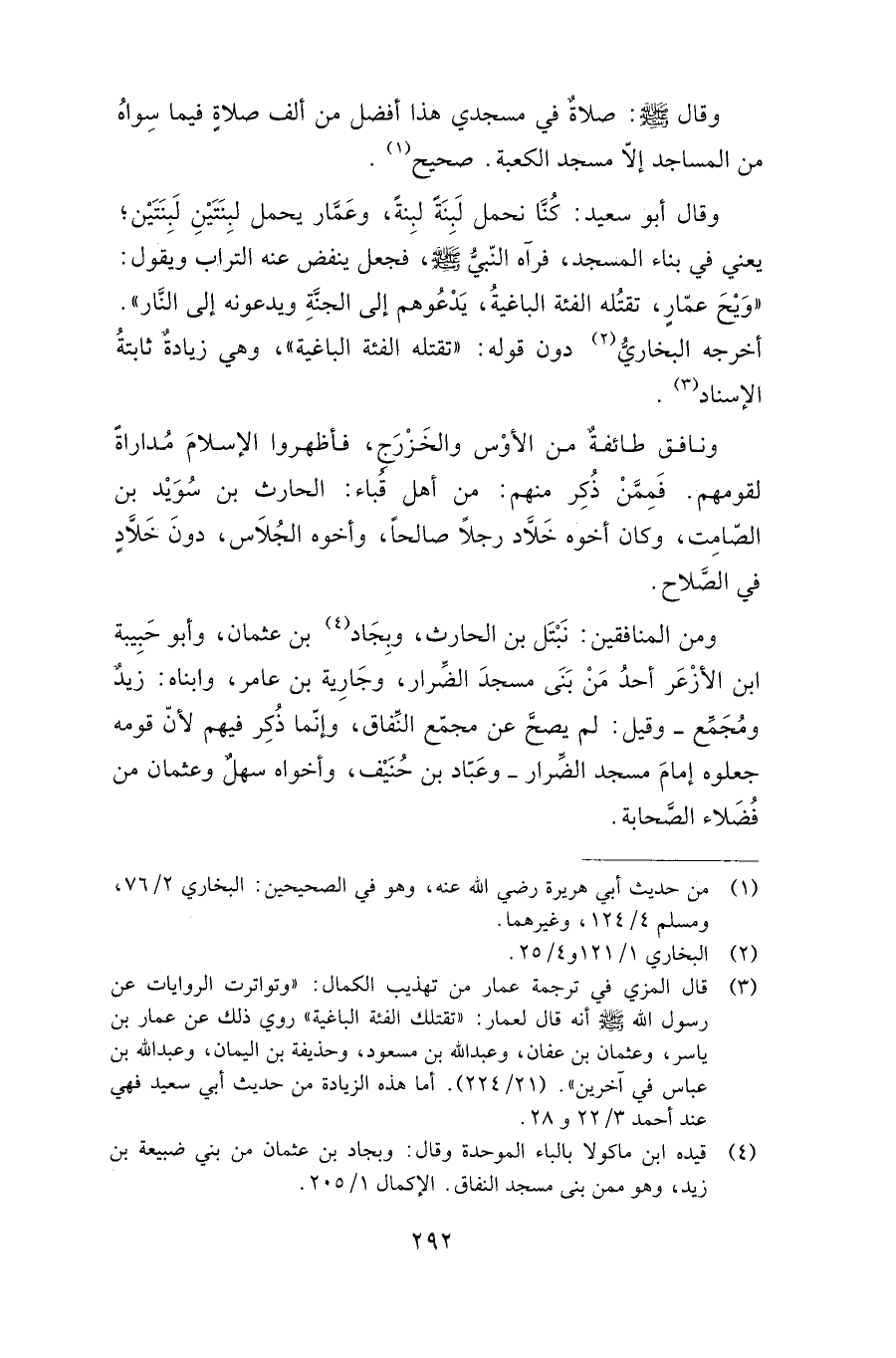 ومن المنافقين: نبتل بن الحارث، وبجاد بن عثمان، وأبو حبيبة ابن الأزعر أحد من بنى مسجد الضرار، وجارية بن عامر، وابناه: زيد ومجمع -وقيل: لم يصح عن مجمع النفاق، وإنما ذكر فيهم لأن قومه جعلوه إمام مسجد الضرار- وعباد بن حنيف، وأخواه سهل وعثمان من فضلاء الصحابة.