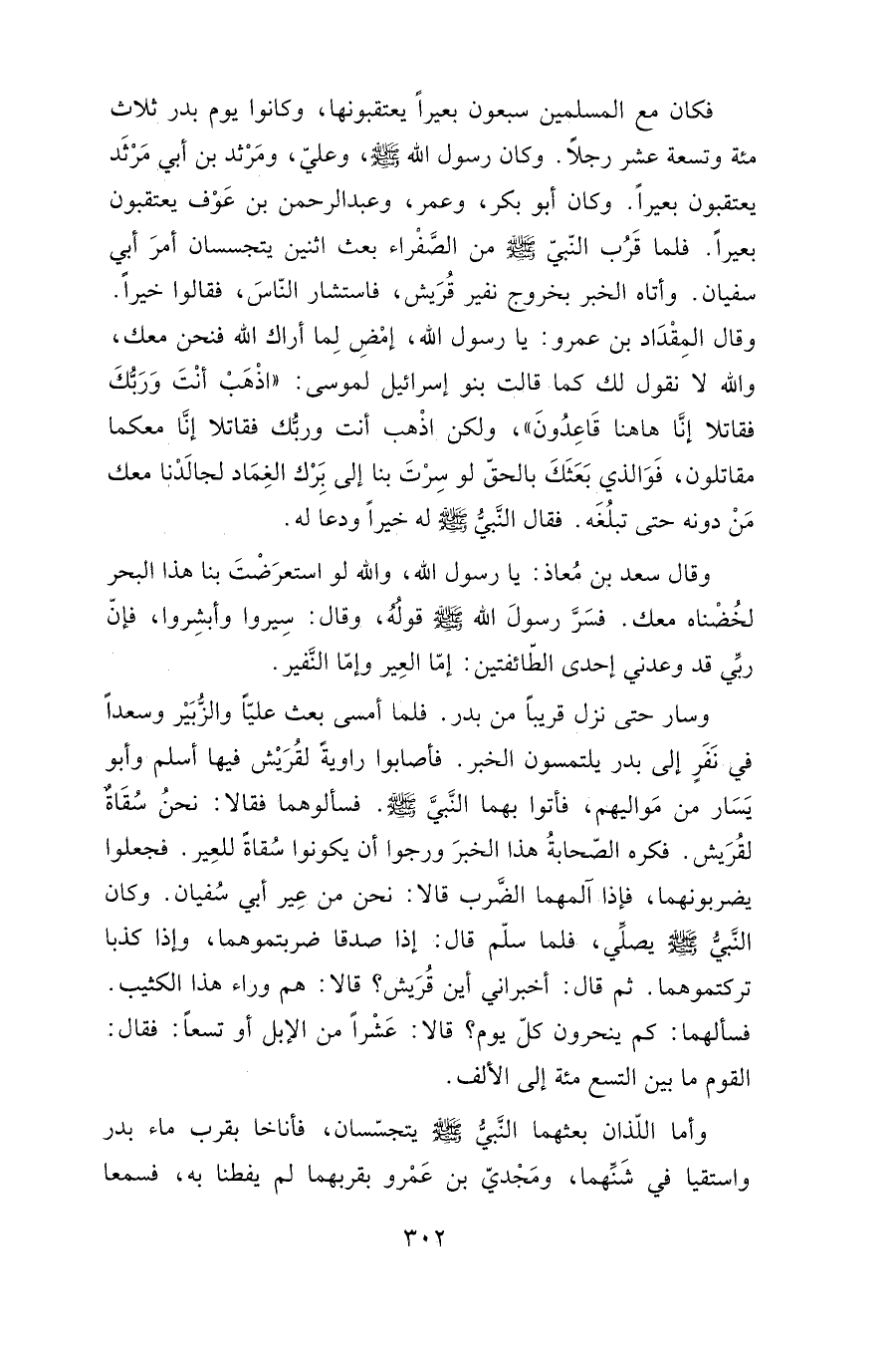 وكان رسول الله صلى الله عليه وسلم، وعلي، ومرثد بن أبي مرثد يعتقبون بعيرا. وكان أبو بكر، وعمر، وعبد الرحمن بن عوف يعتقبون بعيرا. فلما قرب النبي صلى الله عليه وسلم من الصفراء بعث اثنين يتجسسان أمر أبي سفيان. وأتاه الخبر بخروج نفير قريش، فاستشار الناس، فقالوا خيرا. وقال المقداد بن عمرو: يا رسول الله، امض لما أراك الله فنحن معك، والله لا نقول لك كما قالت بنو