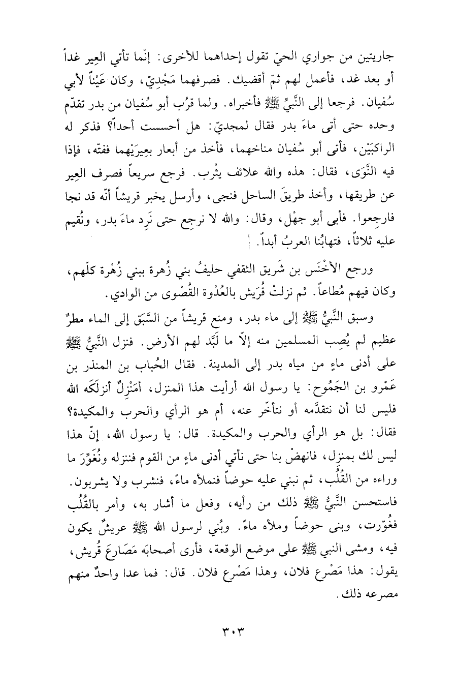 جاريتين من حواري الحي تقول إحداهما للأخرى: إنما تأتي العير غدا أو بعد غد، فأعمل لهم ثم أقضيك. فصرفهما مجدي، وكان عينا لأبي سفيان. فرجعا إلى النبي صلى الله عليه وسلم فأخبراه. ولما قرب أبو سفيان من بدر تقدم وحده حتى أتى ماء بدر فقال لمجدي: هل أحسست أحدا؟ فذكر له الراكبين، فأتى أبو سفيان مناخهما، فأخذ من أبعار بعيريهما ففته، فإذا فيه النوى، فقال: هذه والله علائف يثرب. فرجع سريعا فصرف العير عن طريقها، وأخذ طريق الساحل فنجى، وأرسل يخبر قريشا أنه قد نجا فارجعوا. فأبى أبو جهل، وقال: والله لا نرجع حتى نرد ماء بدر، ونقيم عليه ثلاثا، فتهابنا العرب أبدا.