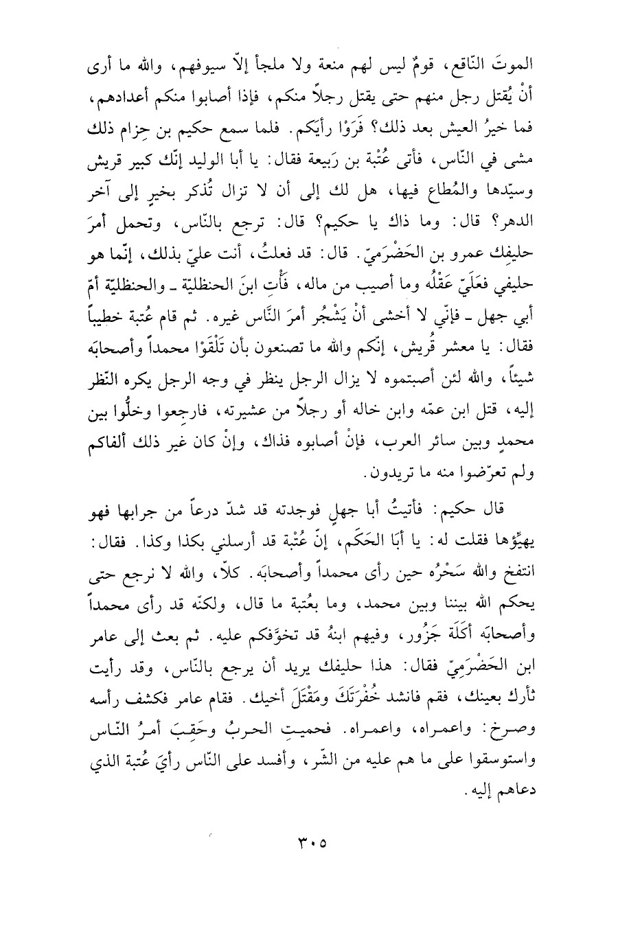 الموتَ النّاقع، قومٌ ليس لهم منعة ولا ملجأ إلاّ سيوفهم، والله ما أرى أنْ يُقتل رجل منهم حتى يقتل رجلاً منكم، فإذا أصابوا منكم أعدادهم، فما خيرُ العيش بعد ذلك؟ فَرَوْا رأيَكم. فلما سمع حكيم بن حِزام ذلك مشى في النّاس، فأتى عُتْبة بن رَبيعة فقال: يا أبا الوليد إنّك كبير قريش وسيّدها والمُطاع فيها، هل لك إلى أن لا تزال تُذكر بخيرٍ إلى آخر الدهر؟ قال: وما ذاك يا حكيم؟ قال: ترجع بالنّاس، وتحمل أمر حليفك عمرو بن الحضرمي، قال: قد فعلت، أنت علي بذلك، إنما هو حليفي فعلي عقله وما أصيب من ماله، فأت ابن الحنظلية -والحنظلية أم أبي جهل- فإني لا أخشى أن يشجر أمر الناس غيره. ثم قام عتبة خطيبا فقال: يا معشر قريش، إنكم والله ما تصنعون بأن تلقوا محمدا وأصحابه شيئا, والله لئن أصبتموه لا يزال الرجل ينظر في وجه الرجل يكره النظر إليه، قتل ابن عمه وابن خاله أو رجلا من عشيرته، فارجعوا وخلوا بين محمد وبين سائر العرب، فإن أصابوه فذاك، وإن كان غير ذلك ألفاكم ولم تعرضوا منه ما تريدون.