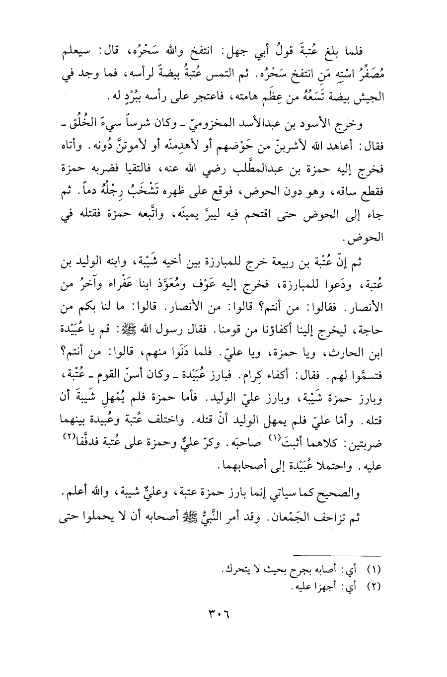 وخرج الأسود بن عبد الأسد المخزومي -وكان شرسا سيئ الخلق- فقال: أعاهد الله لأشربن من حوضهم أو لأهدمنه أو لأموتن دونه. وأتاه فخرج إليه حمزة بن عبد المطلب -رضي الله عنه- فالتقيا فضربه حمزة فقطع ساقه، وهو دون الحوض، فوقع على ظهره تشخب رجله دما. ثم جاء إلى الحوض حتى اقتحم فيه ليبر يمينه، واتبعه حمزة فقتله في الحوض.