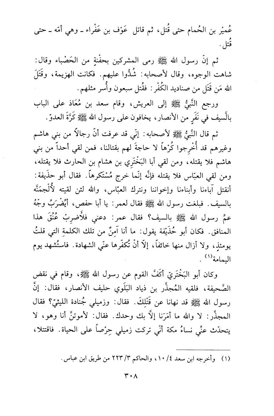 ثم قال النبي صلى الله عليه وسلم لأصحابه: "إني قد عرفت أن رجالا من بني هاشم وغيرهم قد أخرجوا كرها لا حاجة لهم بقتالنا، فمن لقي أحدا من بني هاشم فلا يقتله، ومن لقي أبا البختري بن هشام بن الحارث فلا يقتله، ومن لقي العباس فلا يقتله فإنه إنما خرج مستكرها". فقال أبو حذيفة: أنقتل آباءنا وأبناءنا وإخواننا ونترك العباس، والله لئن لقيته لألجمنه بالسيف. فبلغت رسول الله صلى الله عليه وسلم فقال لعمر: "يا أبا حفص أيضرب وجه عم رسول الله صلى الله عليه وسلم بالسيف"؟. فقال عمر: دعني فلأضرب عنق هذا المنافق. فكان أبو حذيفة يقول: ما أنا آمن من تلك الكلمة التي قلت يومئذ، ولا أزال منها خائفا، إلا أن تكفرها عني الشهادة. فاستشهد يوم اليمامة.